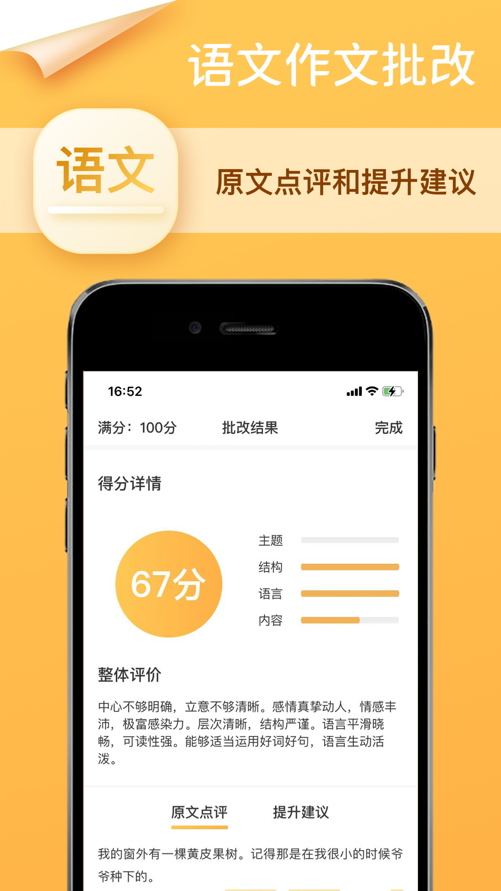 3、语文作文批改:可拍照和粘贴作文原文内容,给予作文整体评价和提升建议