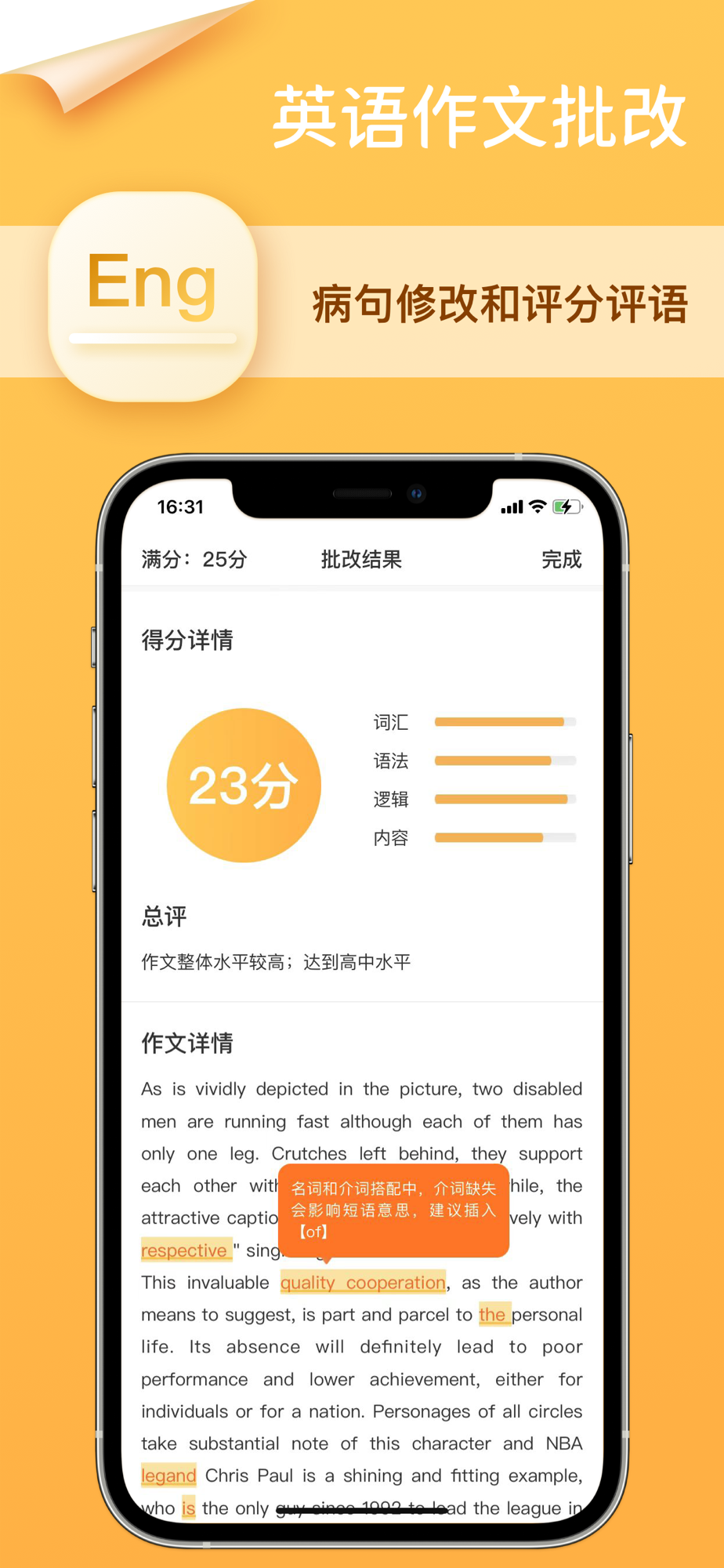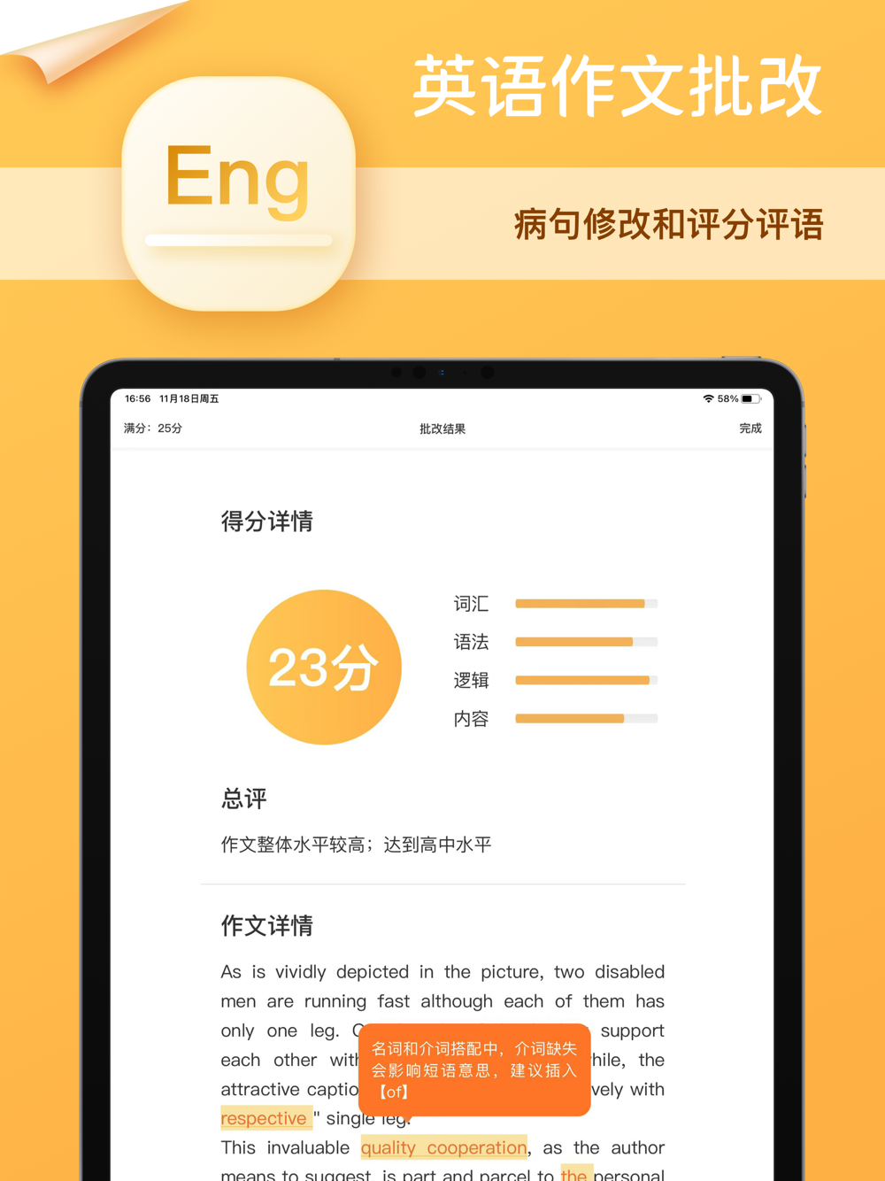 2、英语作文批改:支持分年级打分,提供病句修改和评语,帮助孩子更好的提升写作水平