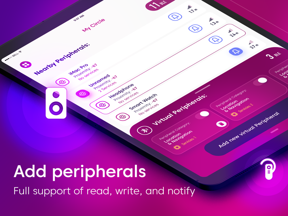 - Connect to nearby bluetooth peripherals and find all info about it