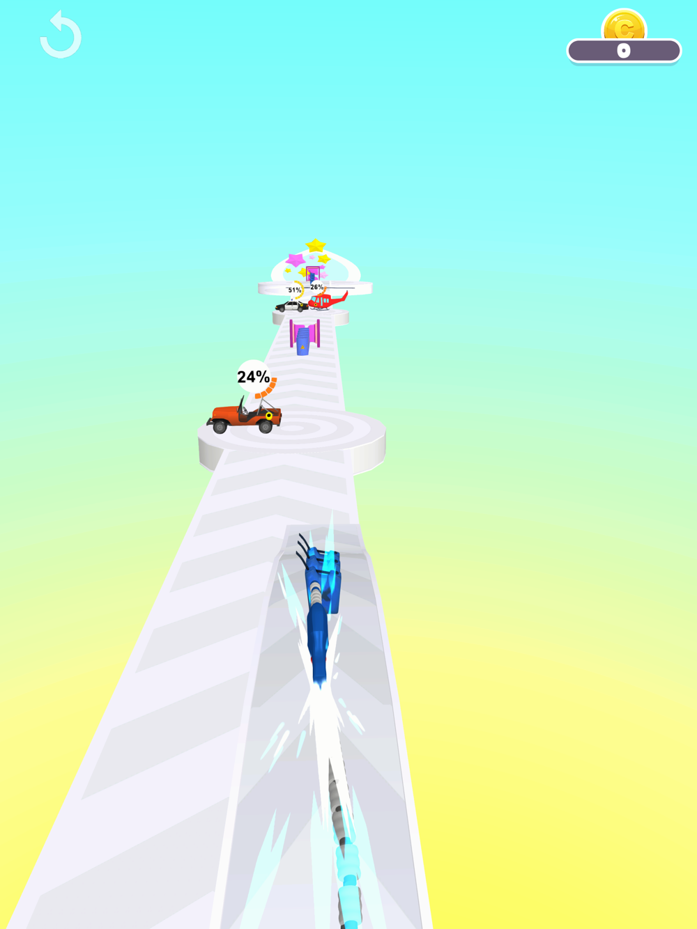 You need to stack gas pump ! You can collect gas on the way and you can use it fill vehicles on they ! Don't forget to dodge obstacles !