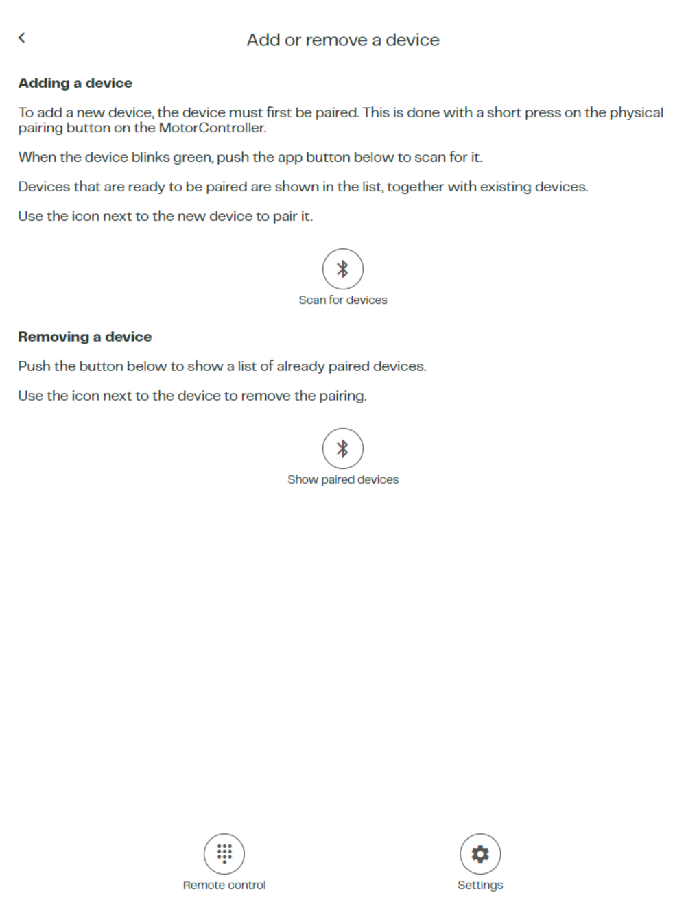 This app offers the same functionality as the physical remote control supplied with the MotorController. But in addition, the app allows you to connect to and control several MotorControllers from the same user interface.