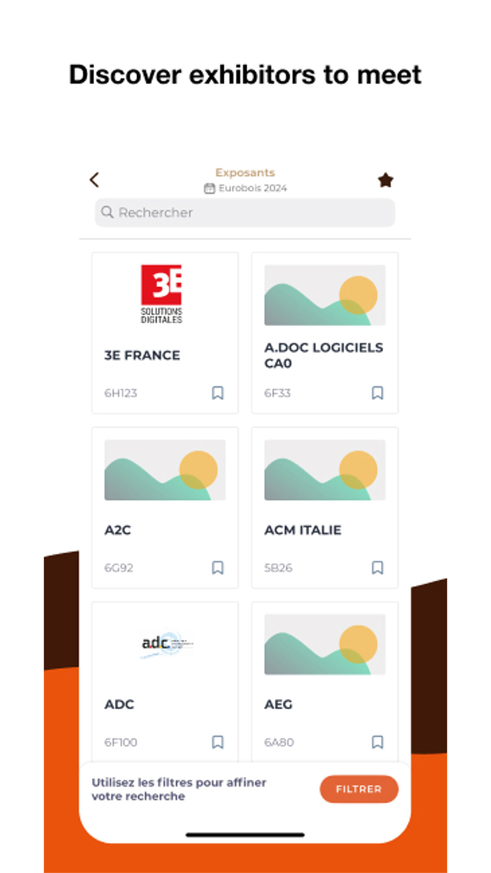 Eurobois Connect is much more than just an application: it lets you boost your business, discover the program of events, new products and exhibitors, prepare your visit (map, list of products and new products, etc.) and facilitate contacts with the entire exhibition community: exhibitors, visitors, partners, etc.
