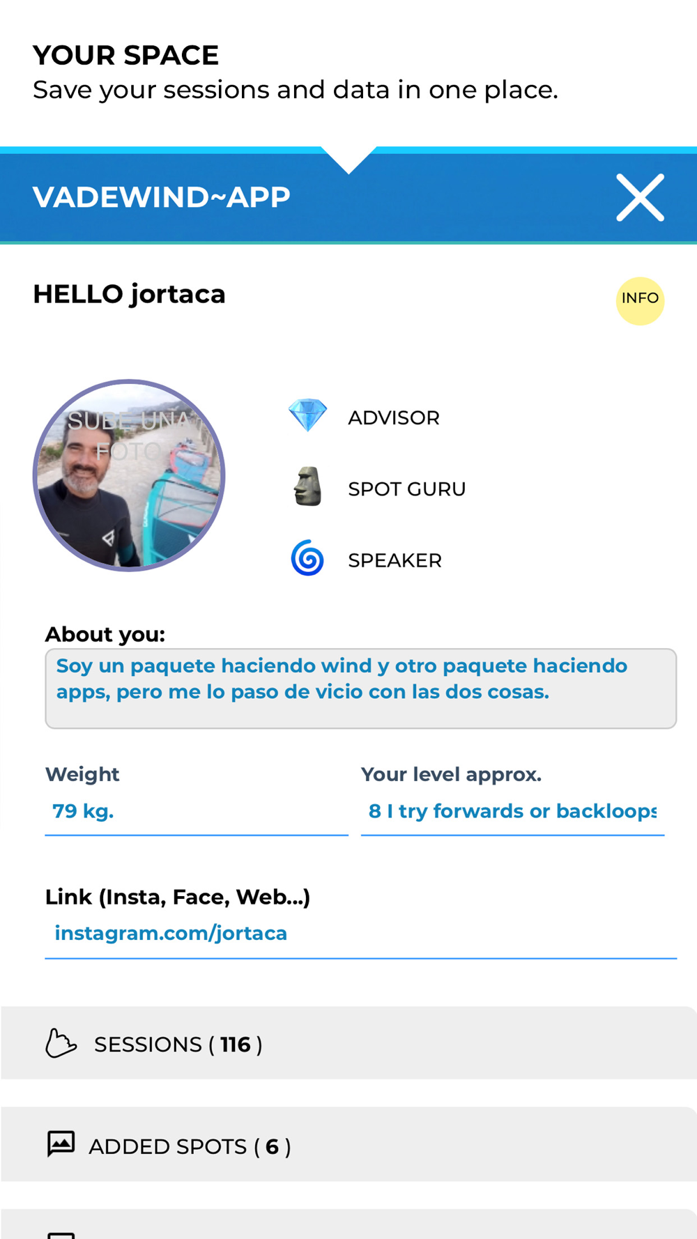 Just like the spots, registered users also generate data related to their activity and thanks to this, from the user account, you can access the sessions enjoyed and all the statistical data obtained as a result. For example, you can see what size sails you have used most often or the wind conditions on a specific past day. Also, which spots you have visited the most, what are your usual conditions... There are endless possibilities.
