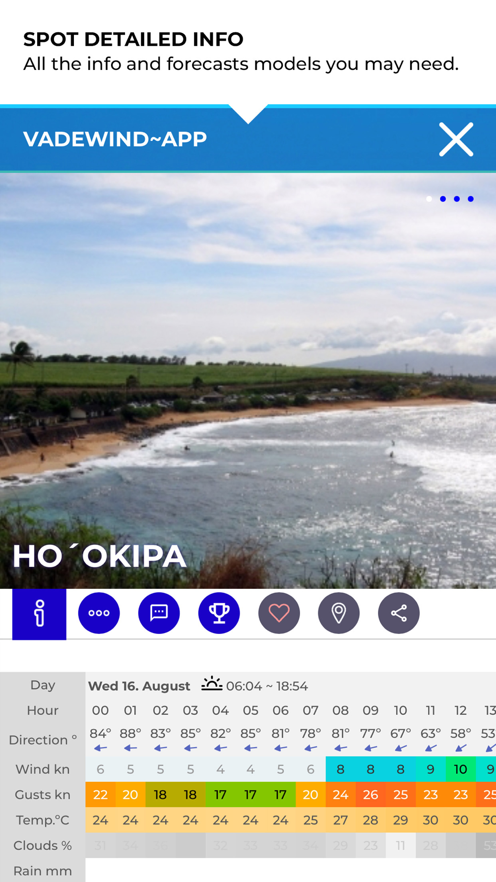 Another important part of the app is the discovery of spots. The app has a global list of spots, dynamically growing, because users can add their favorite spots. Get to know all the detailed info of the spot written by a local and the weather forecasts from the best wind models.