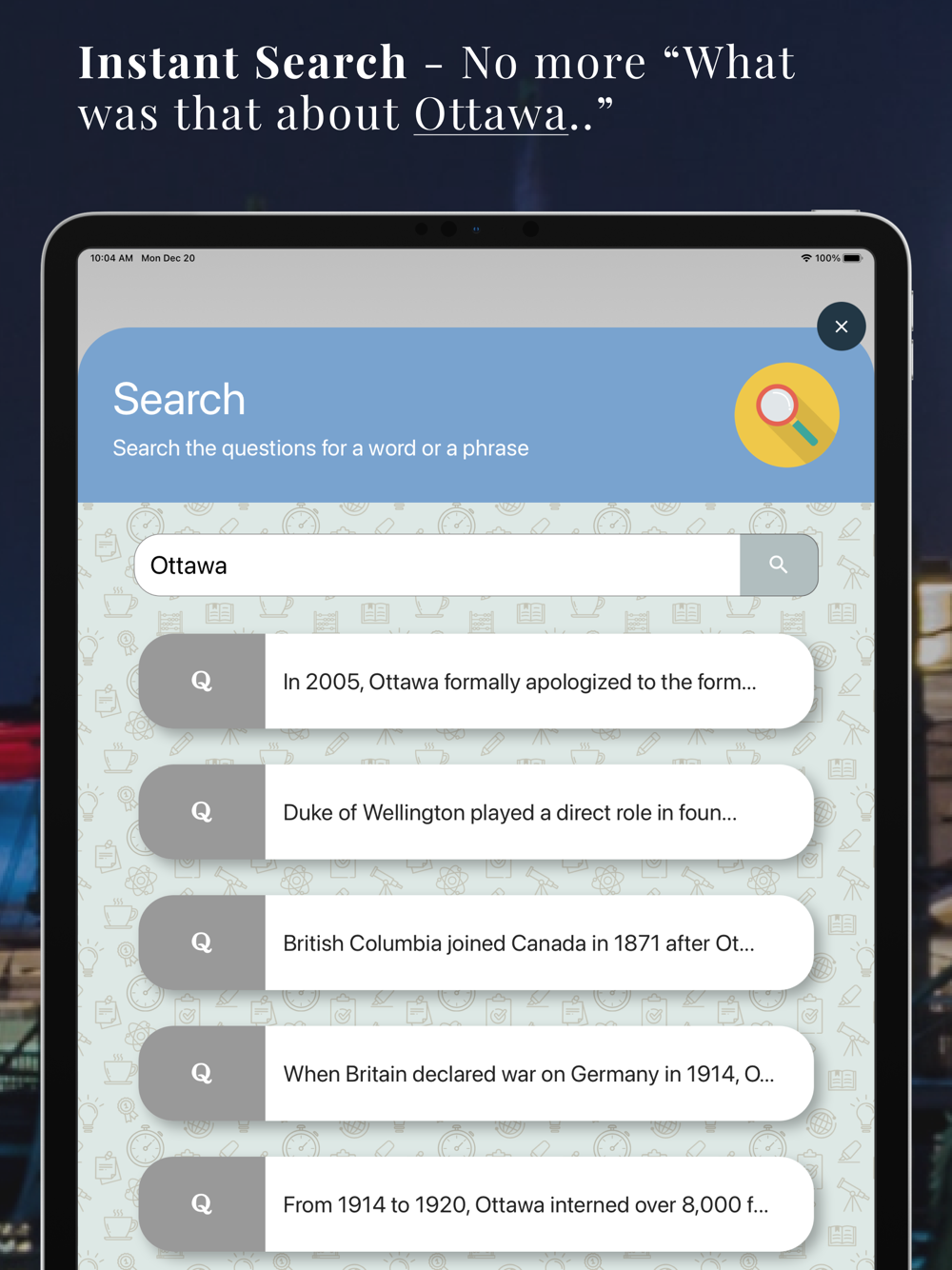 - Exclusive instant search - Type “Parliament” and get all the questions about the Parliament. No more “What was that question about...”.