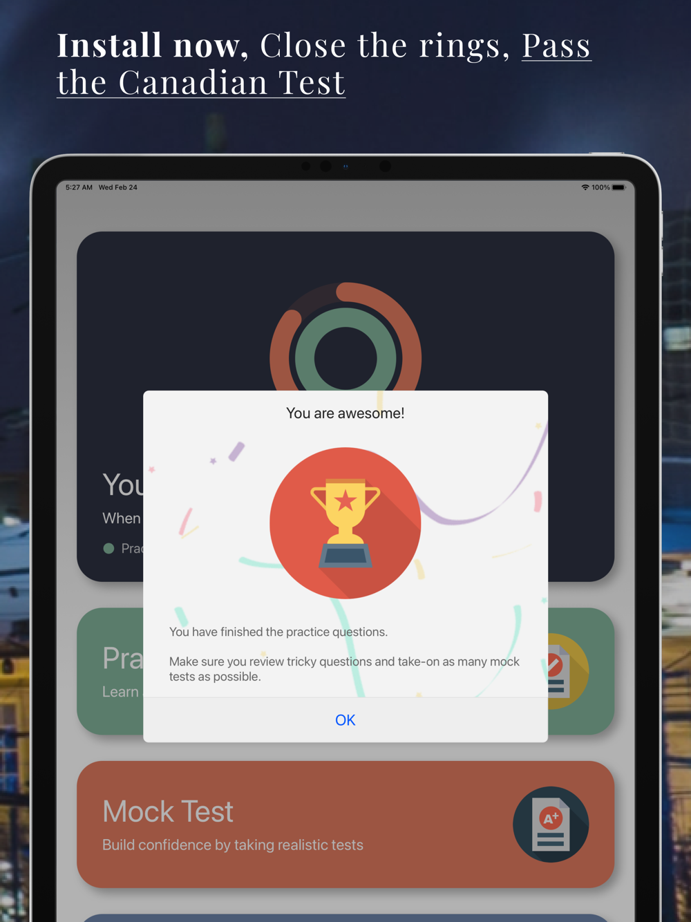 - Exclusive progress meter - Close the rings and we guarantee you will pass your Canadian Citizenship test. It is so simple - Install the app, close the rings, pass the test.