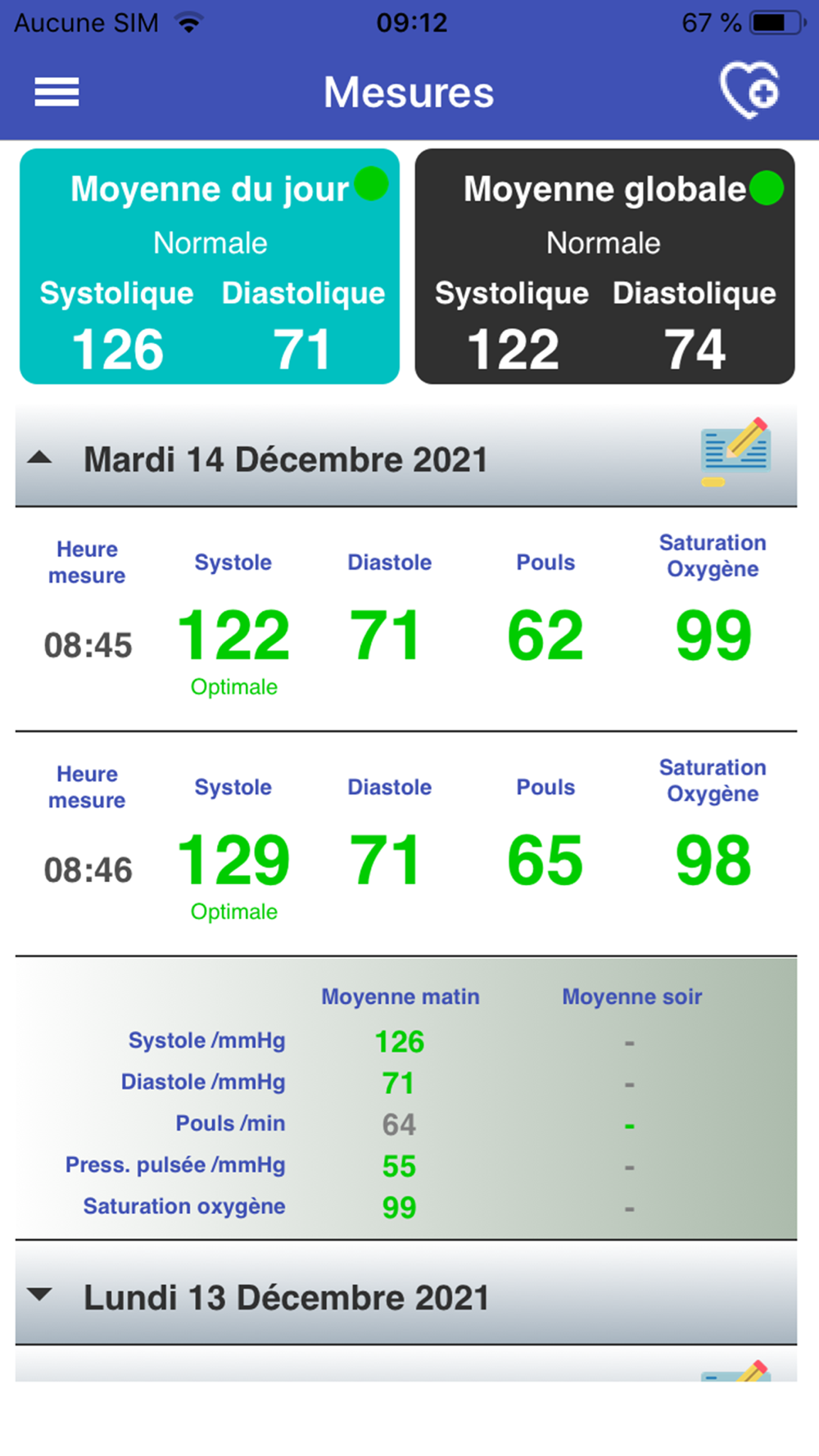 A single reading at your doctor's office does not always reflect reality, as blood pressure varies according to fatigue, emotion, stress, etc. To reduce the risk of error, you can take your blood pressure yourself, with a suitable blood pressure measuring device that you can buy in shops or any pharmacy. (note: this application is not a device for measuring your blood pressure; you need a suitable medical blood pressure monitor).