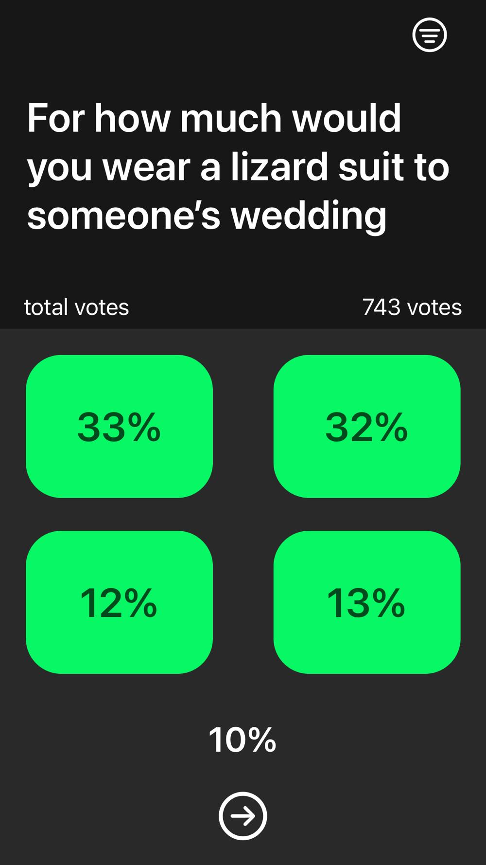 Play the new, original trivia game! Want to know what other people would do for money? Vote on over hundreds of questions. The game is simple, fast, and fun! Play on road trips, when bored, or just for fun. Choose between this or that!