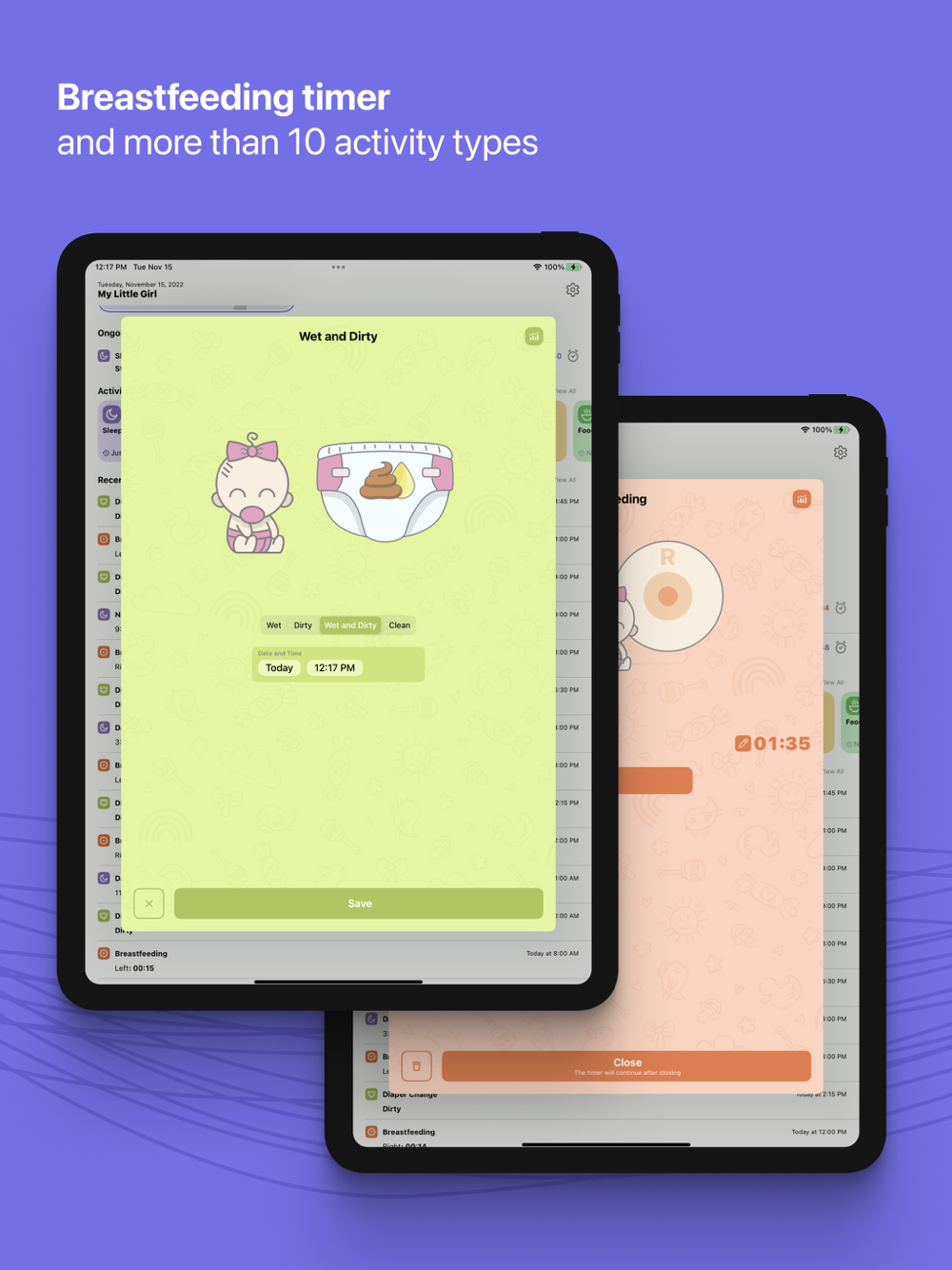 Keep track of the important activities of your baby (breastfeeding, nutrition, sleep, stroll, diaper change, pumping, complementary foods, medicines, temperature, drinks). That will help you establish a baby’s regime, save time, and improve communication with your baby.