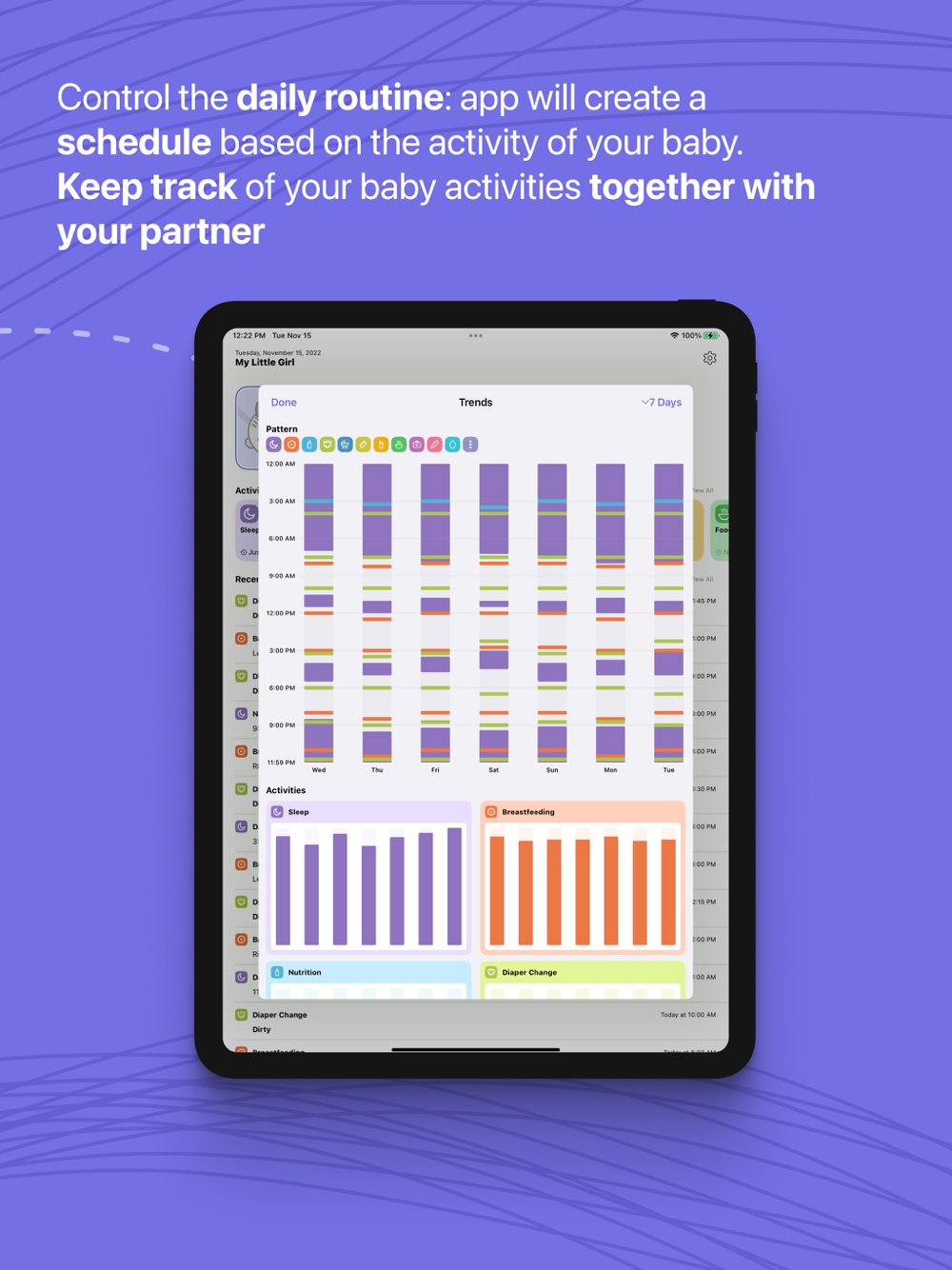 PATTERN AND TRENDS. Keep tracking the important activities and watch your baby's trends and patterns. That will let you better understand what the baby needs and adjust your baby’s schedule.