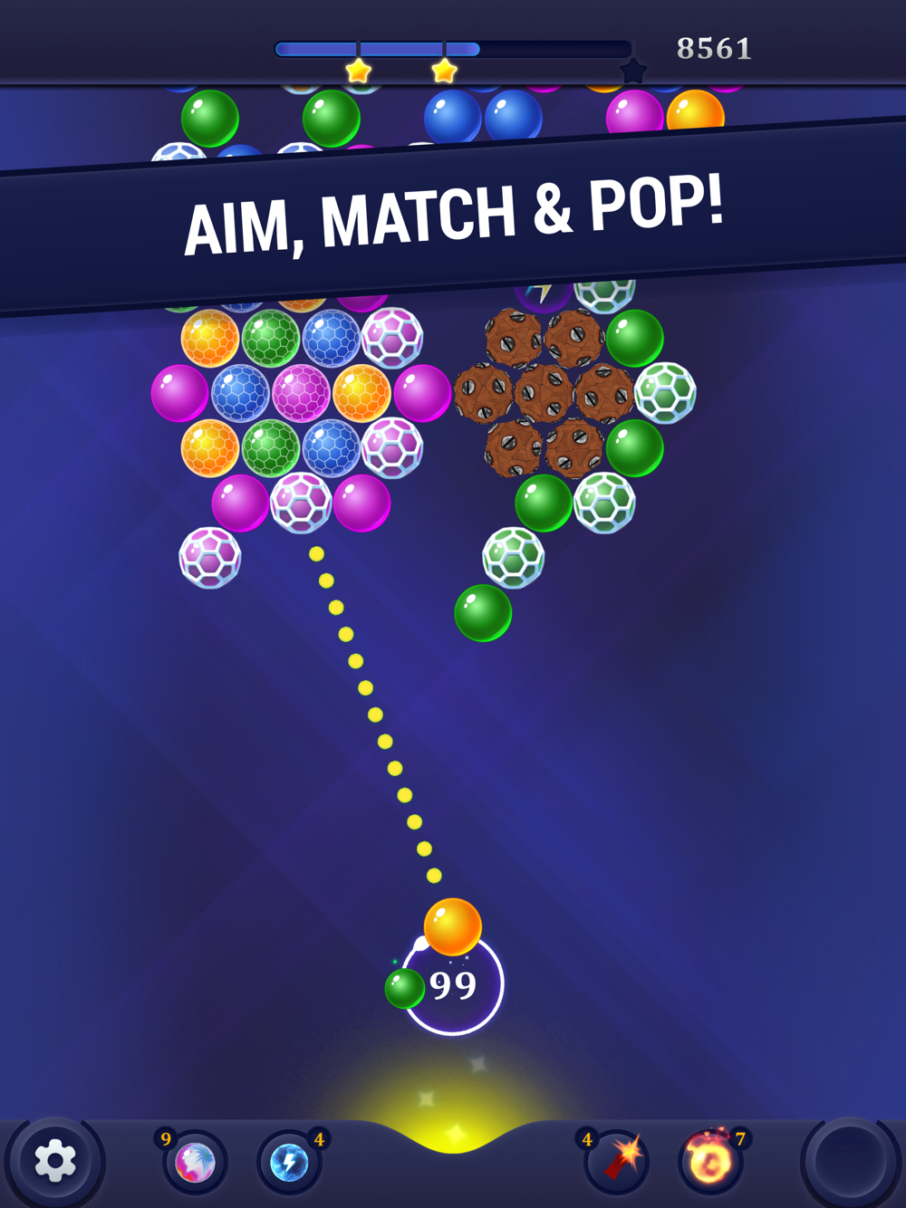 Aim & shoot, drop & burst colorful bubbles complete the mission. Challenge yourself a little extra with each level unlocked and win exciting rewards and stars. Earn coins while you play and use them to get cool boosters. Dive deep into the world's colorful break free balloon-bursting adventure with brain-teasing puzzles and addictive levels. A never-ending ball burst journey with spectacular animation, daily rewards, challenging levels, spin wheel, powerups, and bombs.