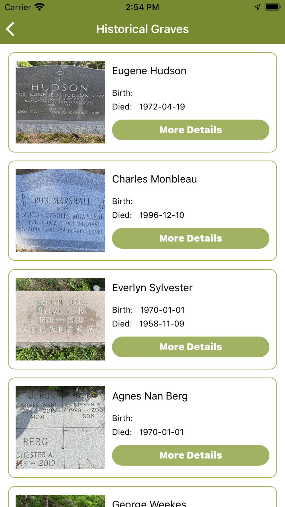 Historical Grave Sites going back to the late 1600's. The App provides a complete user directory with GPS co-ordinates for gravesites and the Marceline Arboretum.