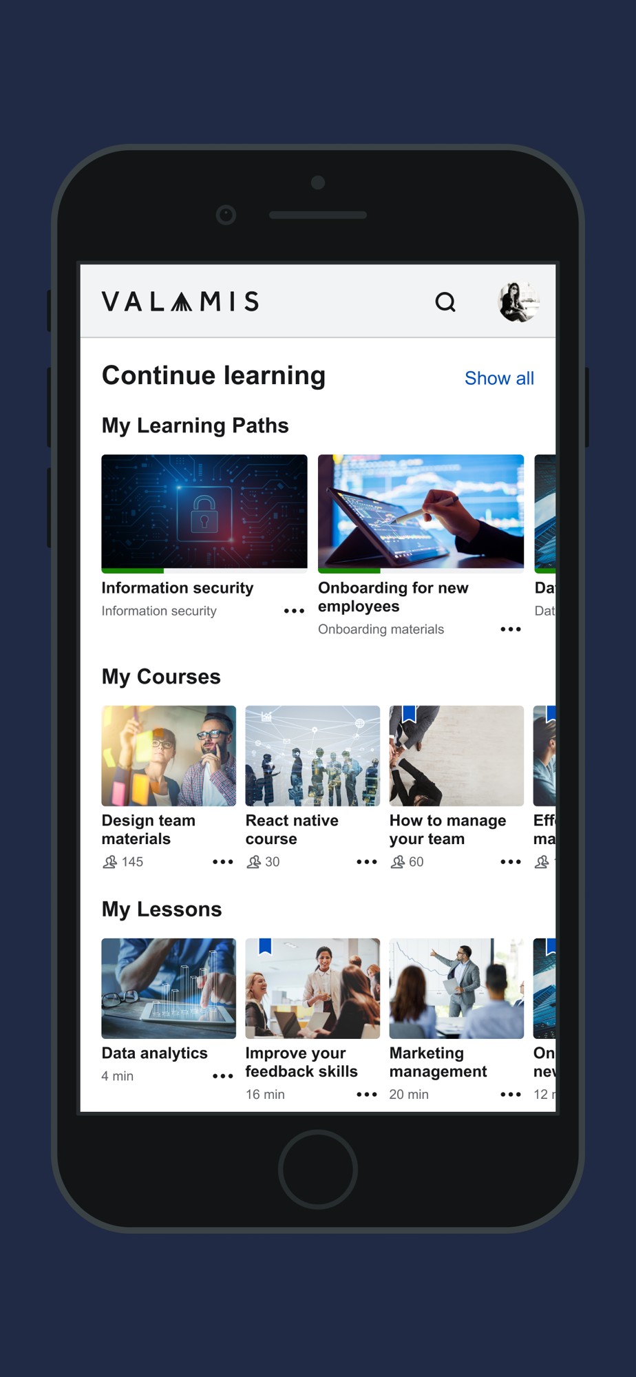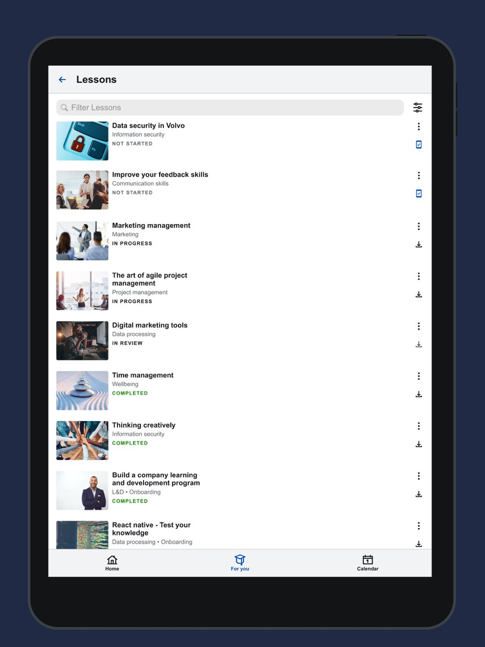 Veida Mobile by Volvo CE Veida Mobile App is designed to bring an engaging learning experience available for you at your fingertips! It is a lightweight version of the Volvo Construction Equipment’s Learning Experience Platform: Veida. Personalized learning Veida offers a personalized learning experience, accessible from all your devices; Regardless if you’re on a job site, on your way to a customer, at the office, an opportunity to learn is always close. Never stop Continue learning where you left off. Veida’s user-centric design makes learning new things a walk in the park. Jump into curated recommendations, continue your learning paths, sign up for upcoming events, and easily share your findings in the social feed – From anywhere, anytime! No internet? No Problem! Veida Mobile App streamlines the mobile learning experience while enriching it with downloadable lessons - perfect for occasions when you are off the grid or cannot access internet and feel like learning something new. Blended Learning Access various learning opportunities, such as eLearning, videos and Instructor-Led/Virtual instructor-Led training. Find learning resources that fit the way you learn and register for events to improve your skills, gain expertise, and become more productive at work to achieve your biggest goals. To be able to use this app you will need to have an account on Volvo Construction Equipment’s Learning Experience Platform: Veida.
