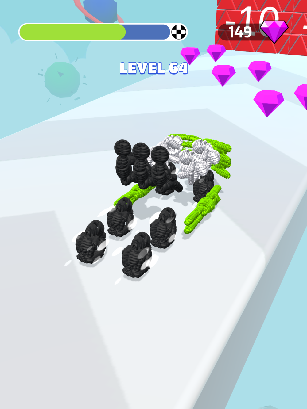 Collect rope-man/stickmen to get bigger vehicles. Avoid different obstacles. Pick the character that's made out of ropes and collect colorful stickmen to grow and progress through the level without hitting hurdles as you will lose rope-man if so.