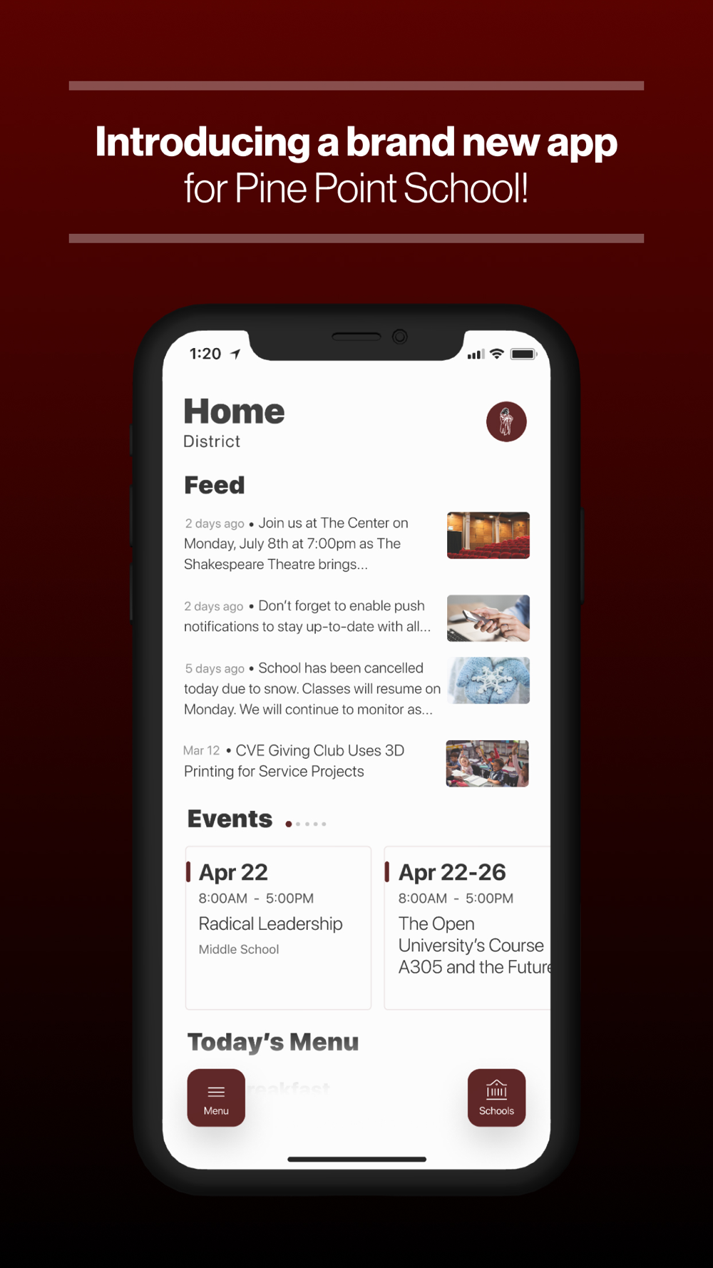 The event section shows a list of events throughout the district. Users can add an event to their calendar to share the event with friends and family with one tap.