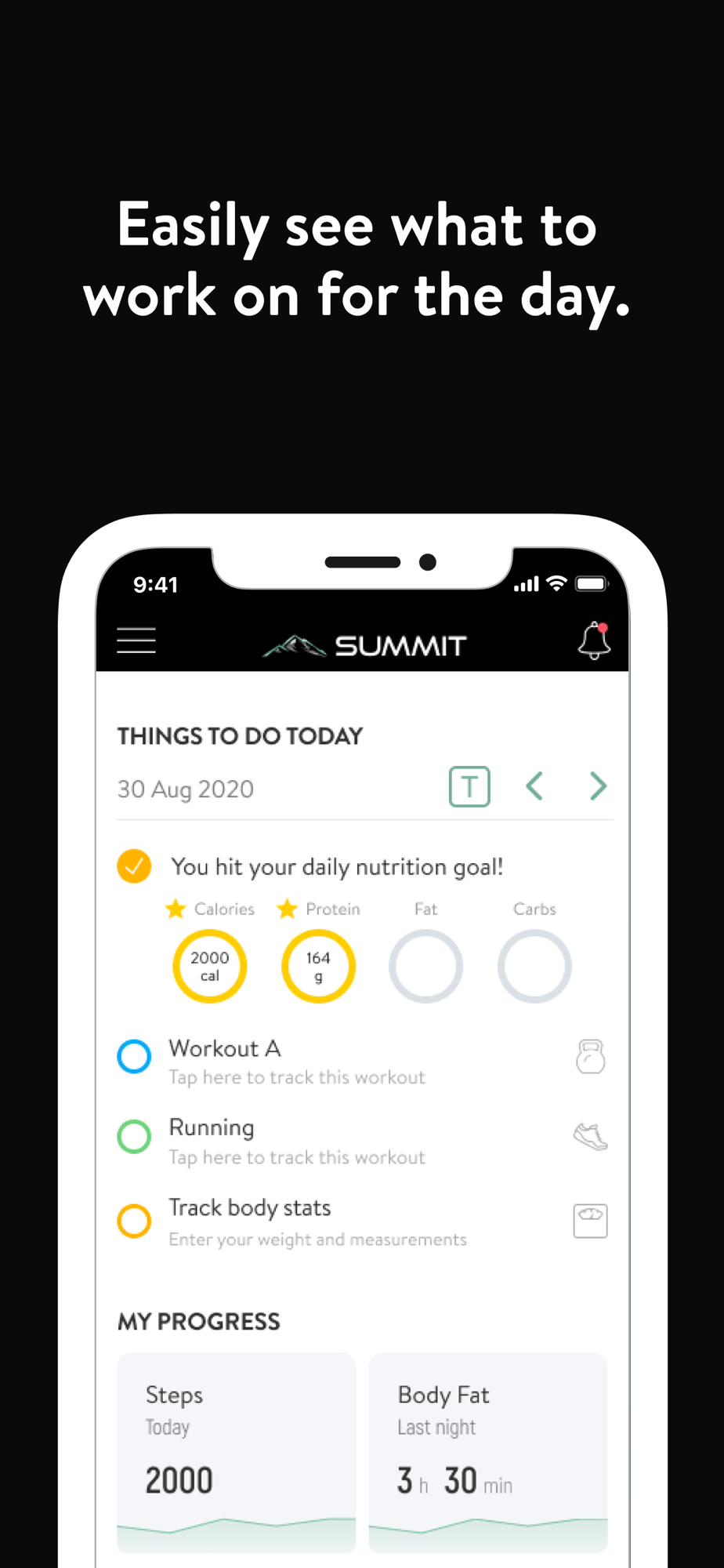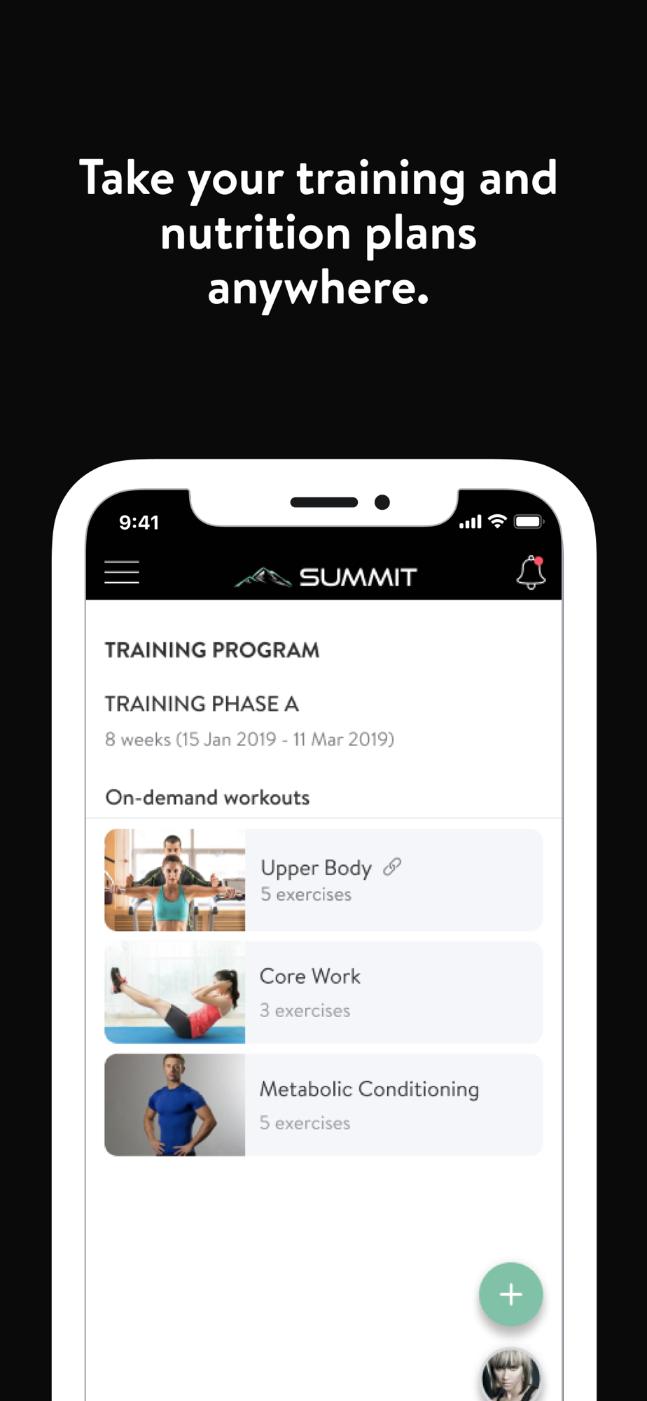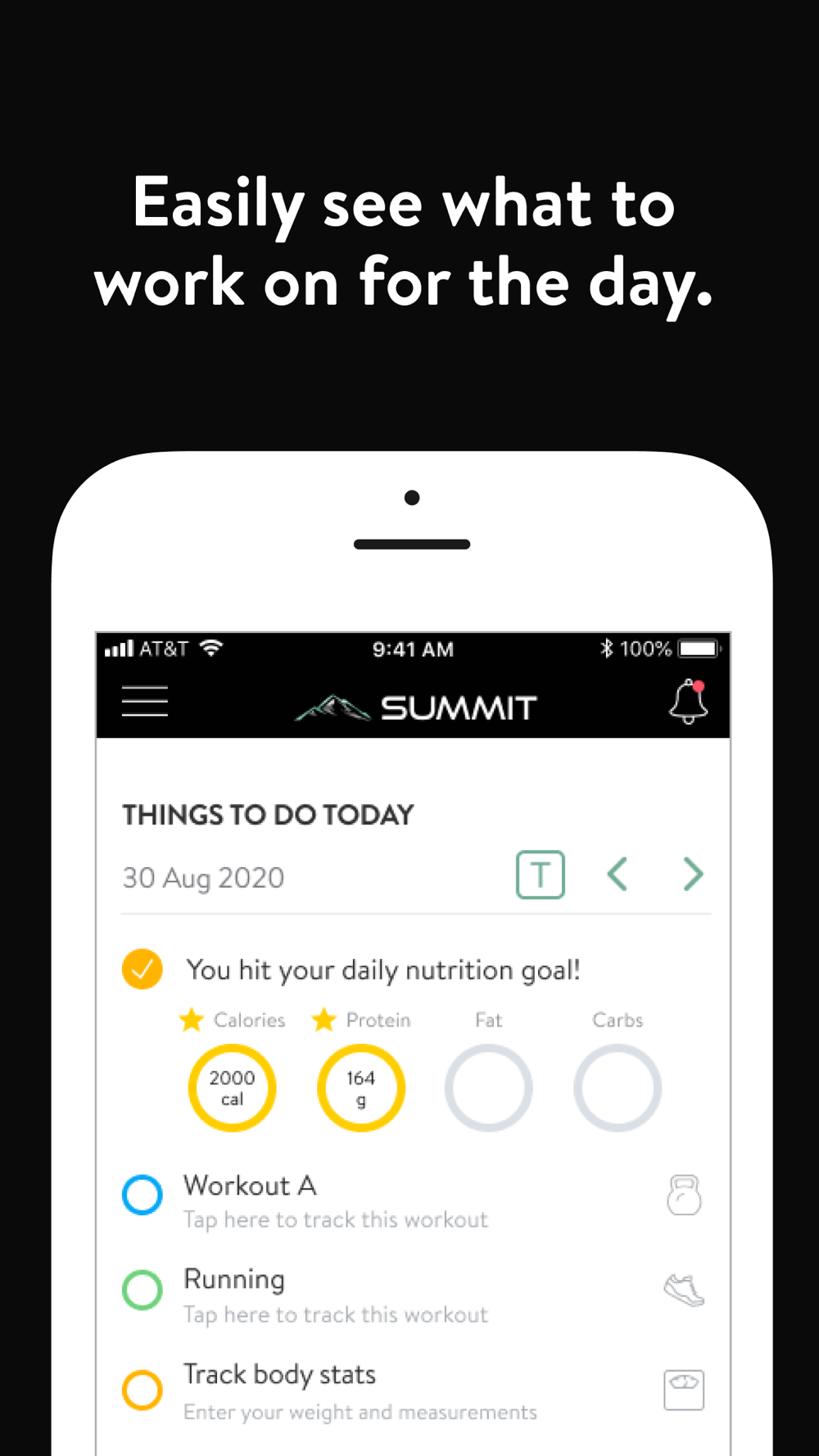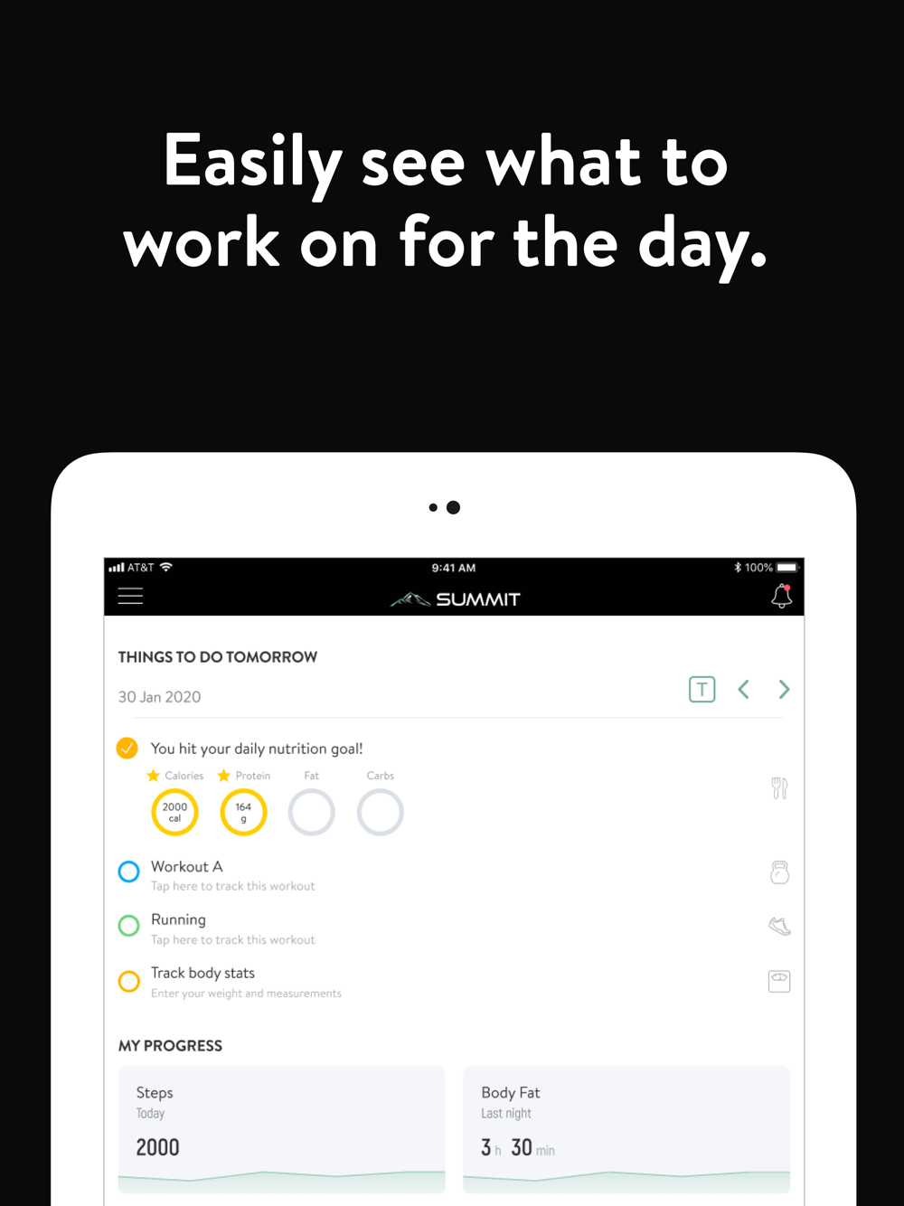 With the Summit Training App, you can start tracking your workouts and meals, measuring results, and achieving your fitness goals, all with the help of your personal trainer.