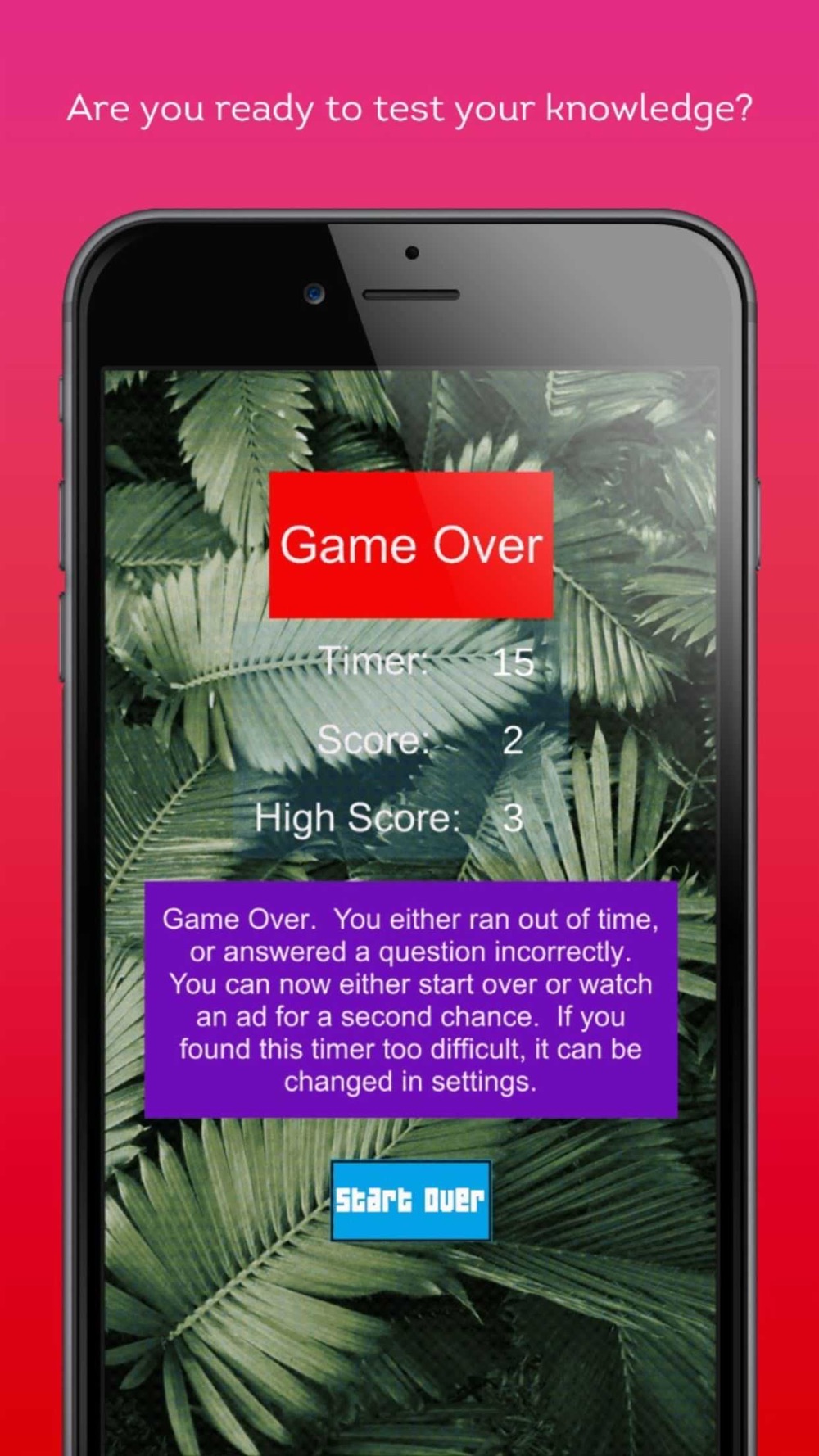 A limited amount of time is given to answer each question, to add challenge and excitement to the game. This timer can be adjusted in the settings menu.