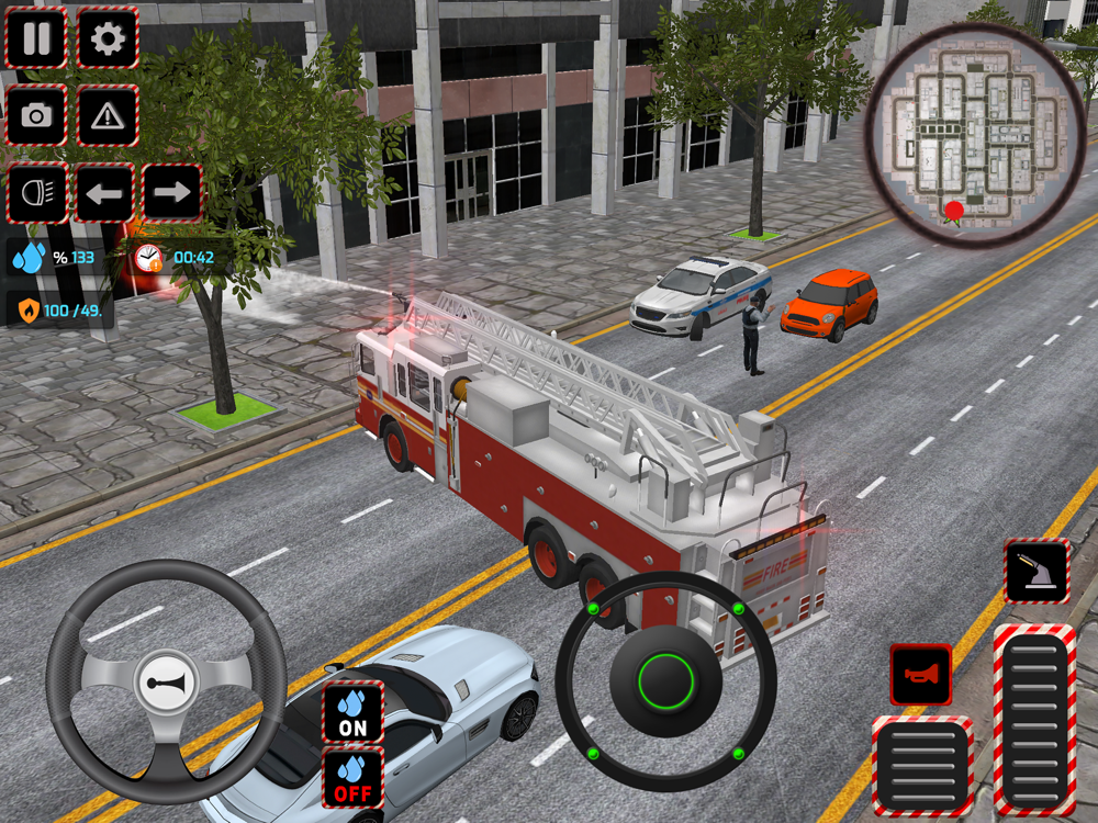 In the safest place where you see the fire, you must extinguish the fires by using the pressurized water control unit on the fire truck.