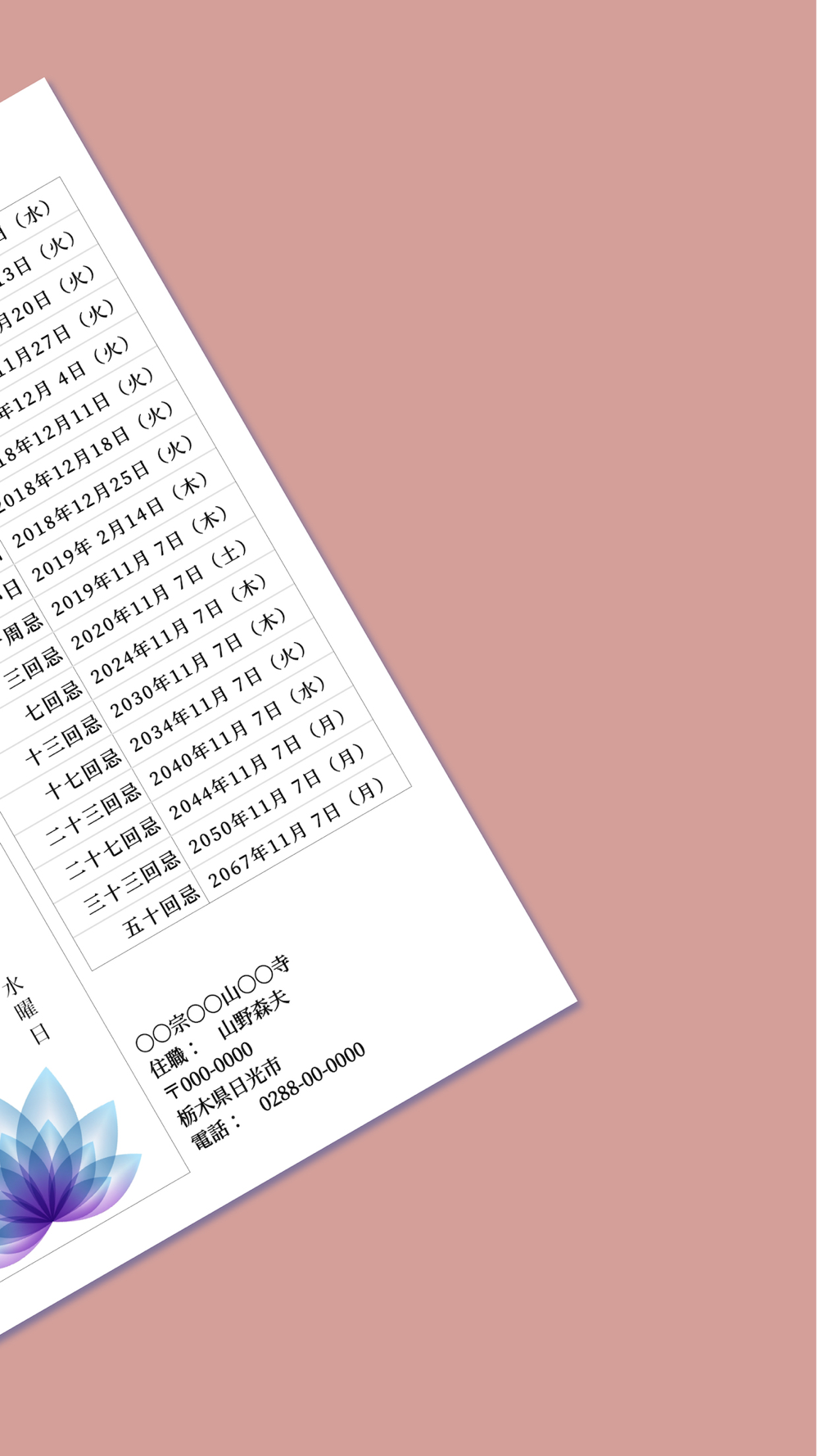 ・忌日表にはお寺の名称や住所などの情報を印刷可能