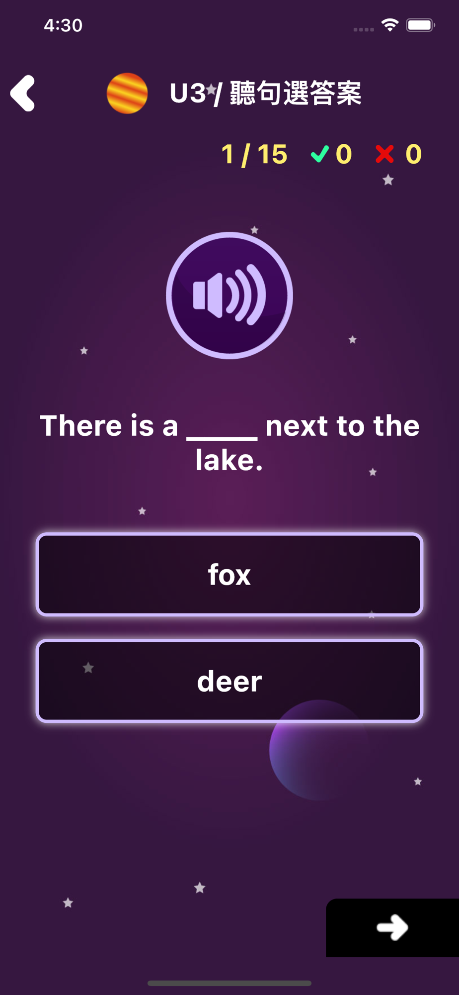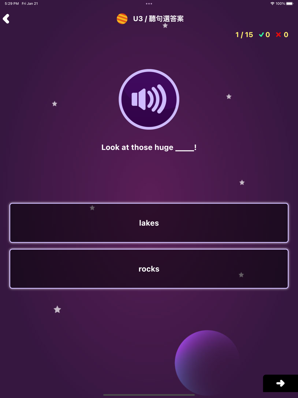 - 聽句選答案:聆聽句子音檔選出正確的單字
