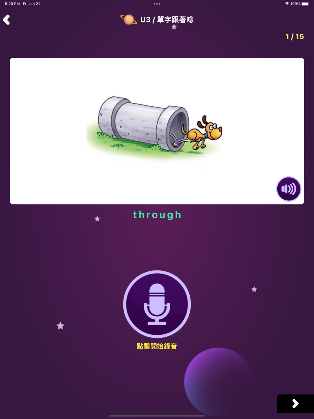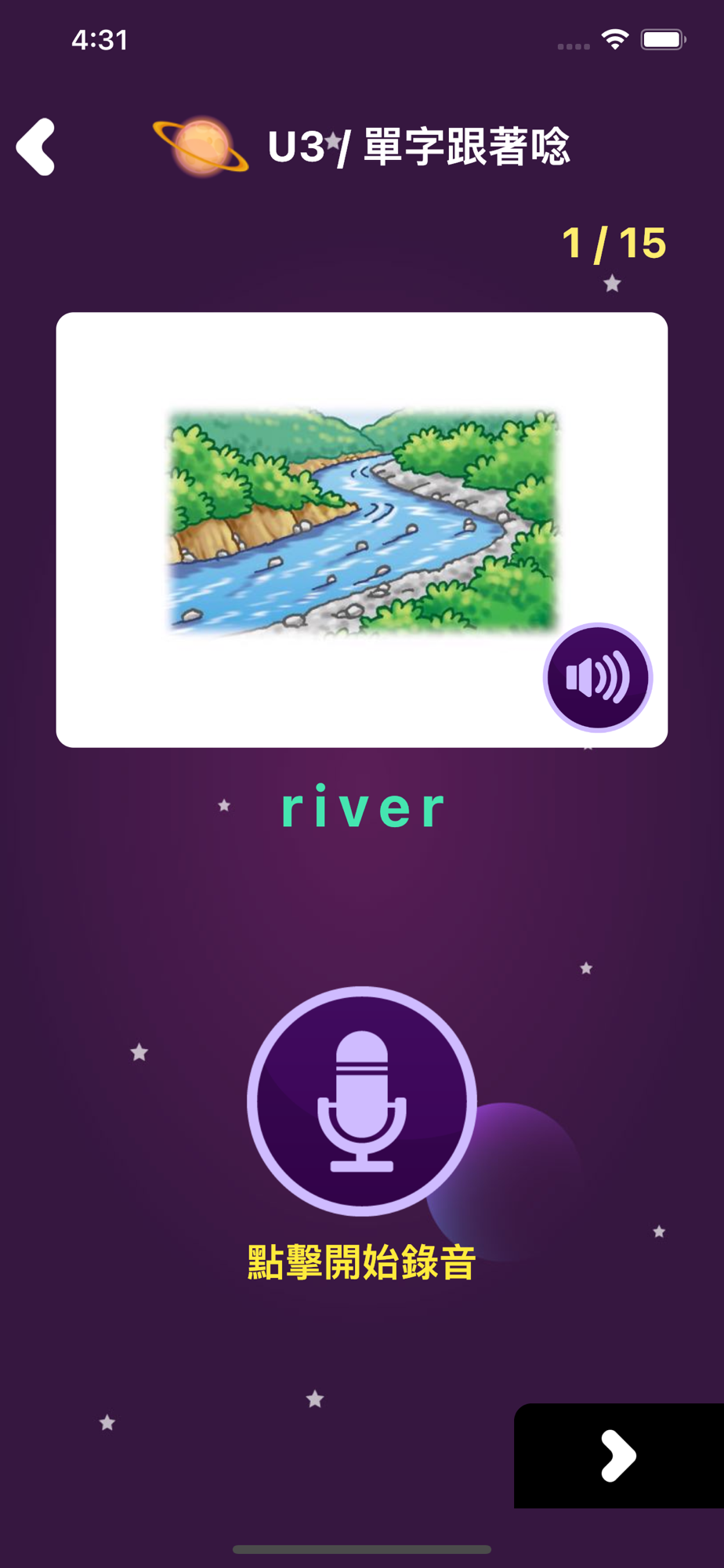 - 單字跟著念:跟著語音練發音,讓專業的AI檢測幫小朋友學到道地的美式發音