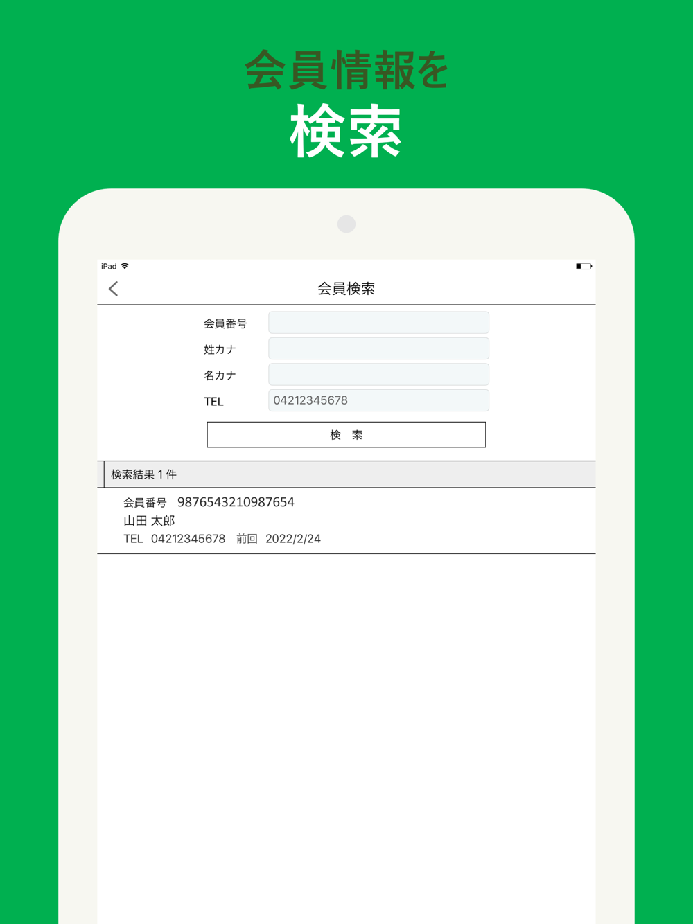 登録してあるお客さんの会員番号、名前や電話番号から検索してポイント操作が可能です。
