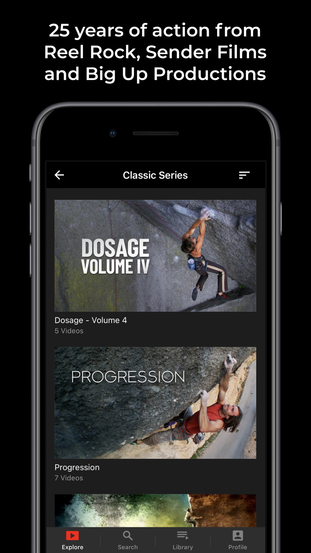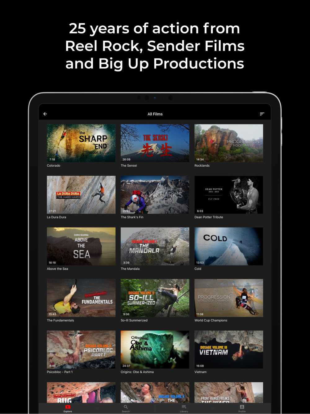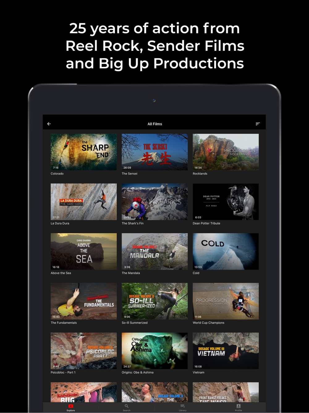All the epic rock climbing, mountaineering and adventure films from Reel Rock, Sender Films and Big Up Productions, created over the last 25 years.
