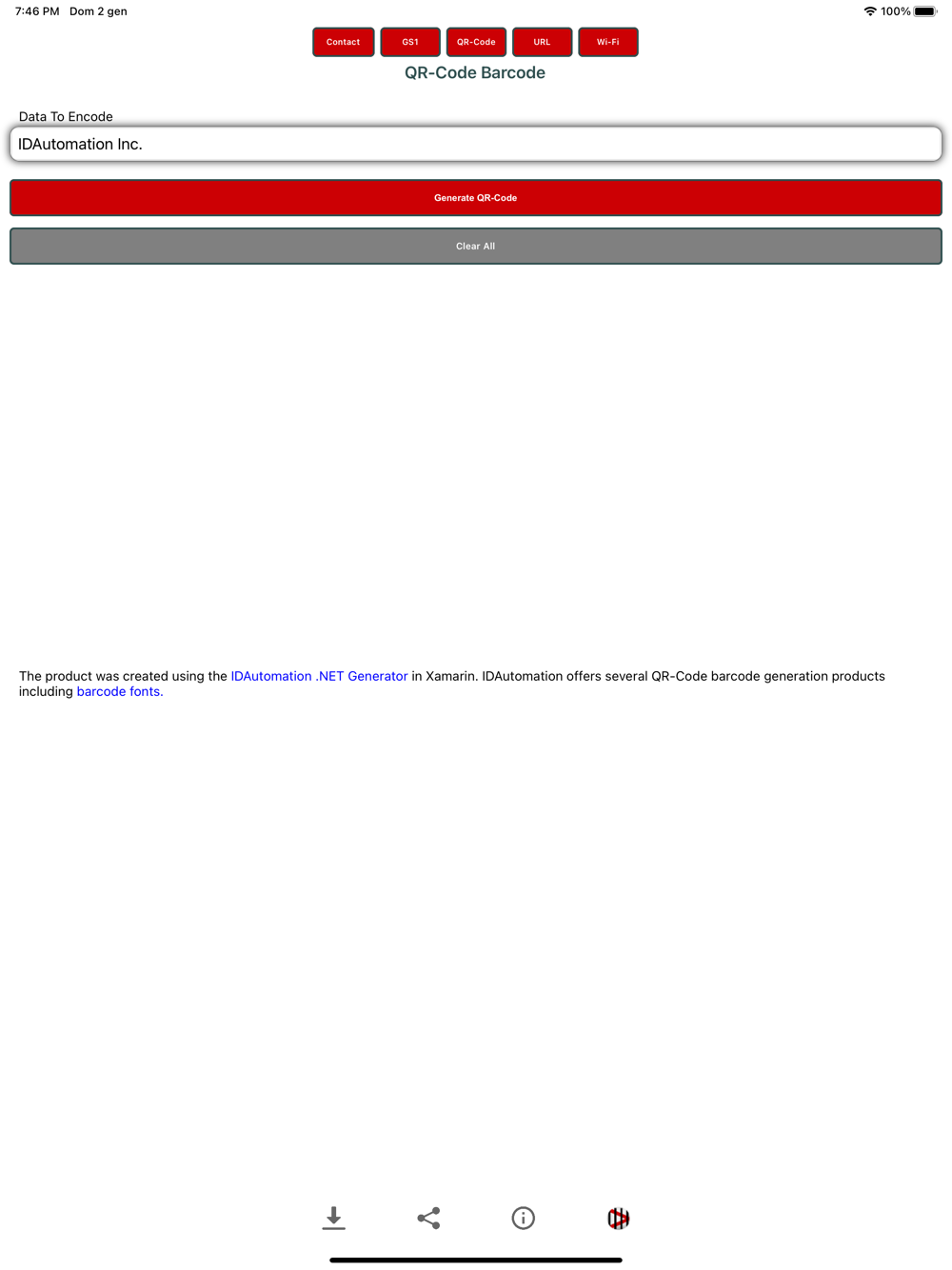 Easily Generate QR-Code symbols that contain your Contact Information like a digital business card. This app also generates QR-Codes for Wi-Fi Auto-Connect, URL Website Redirection, and GS1 Data. Symbols generated may be saved or shared. This app was created using the IDAutomation .NET Generator in Xamarin.