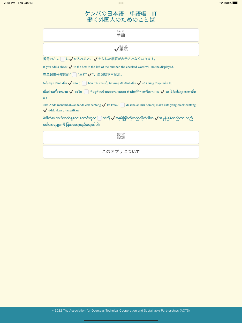 このアプリで、『ゲンバの日本語 単語帳 IT 働く外国人のためのことば』の見出し語の音声を聞くことができます。