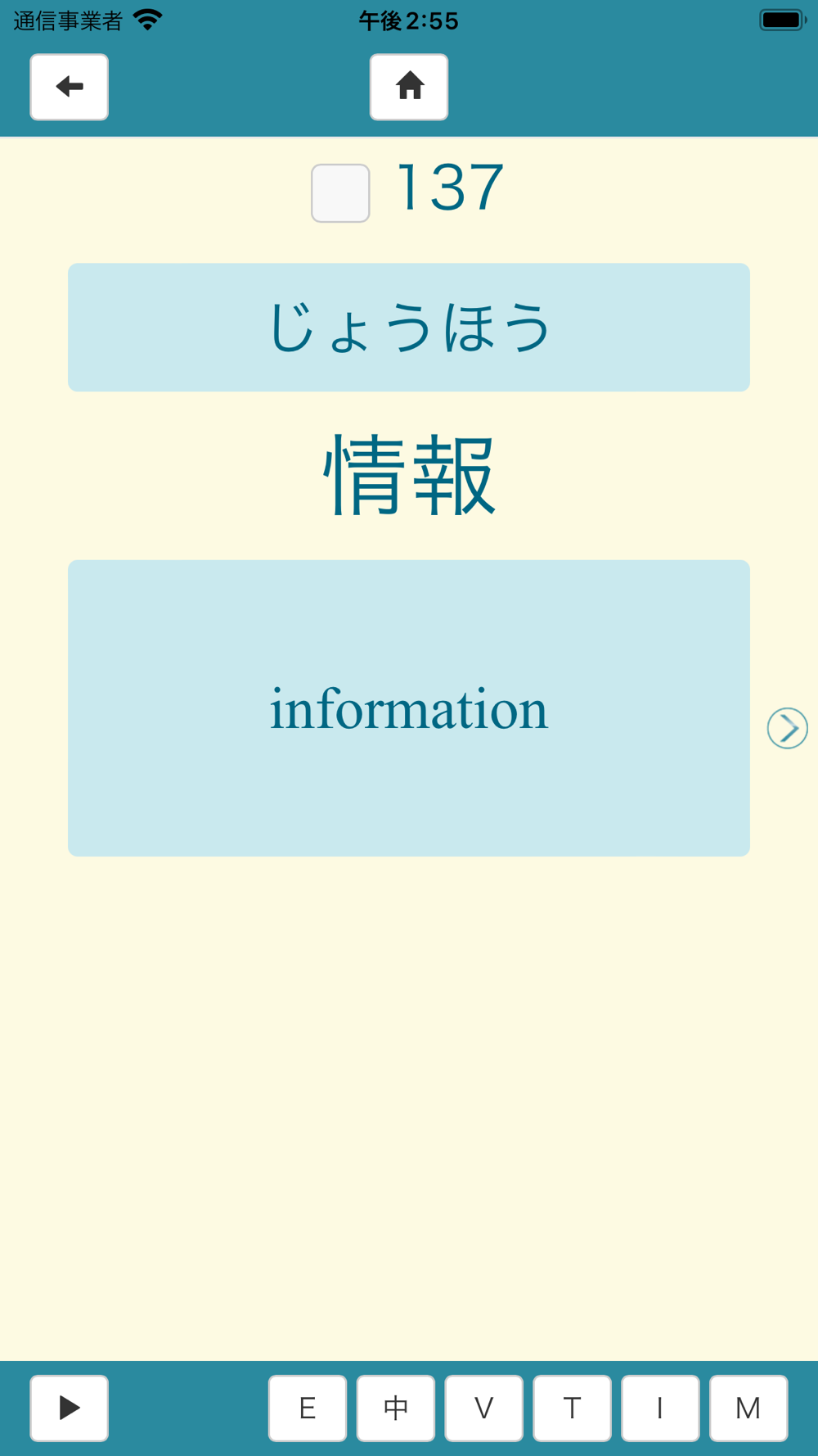 「I 単語」のチェックボックスにチェックを入れていない単語が並びます。まだ覚えていない単語を確認することができます。