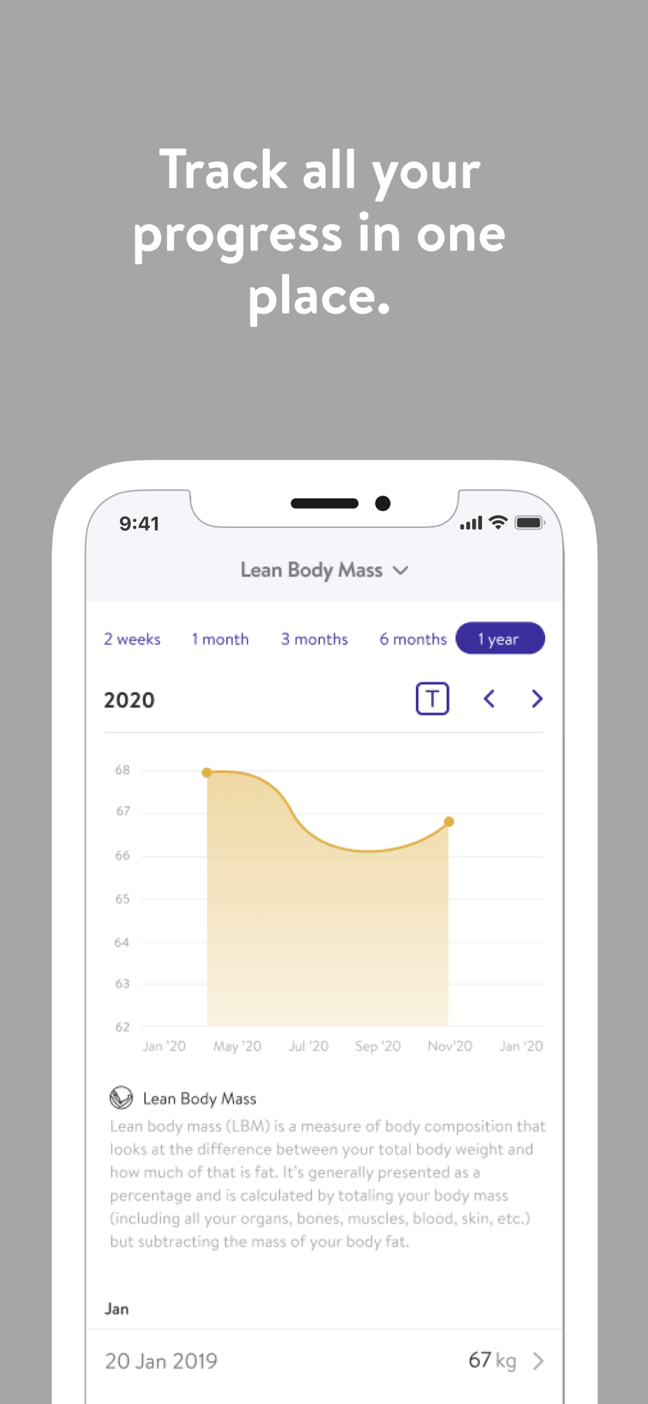 - Track body measurements and take progress photos