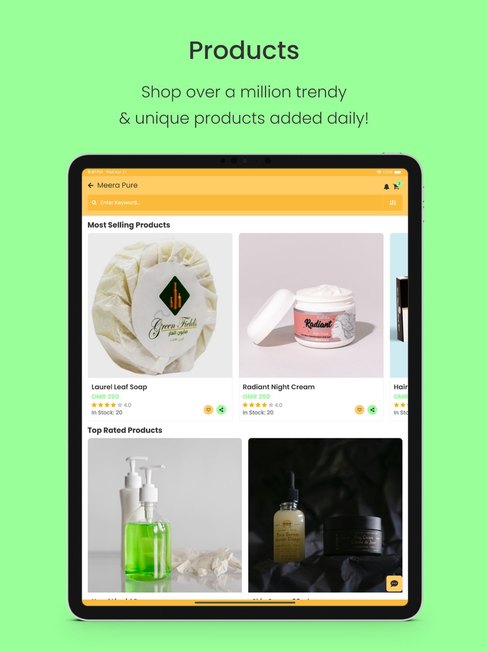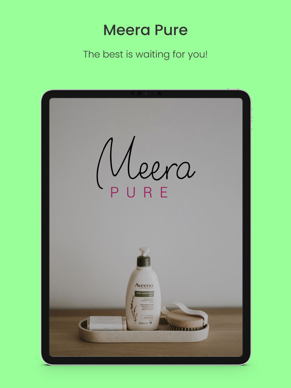 المتجر يقدم منتجات طبيعية 100% وهي منتجات للعناية بالذات وتشمل مجموعات مختلفة للعناية بالبشرة والتي تضم بدورها مجموعة العناية بالبشرة، والغسول العضوي، ومجموعة زيوت الجسم الخاصة وكذلك صابون، بلسم، سيريم وهي خلاصه الابداع الانتاجي من خلال قسم البحوث والتطوير والمنتجات المزروعة بكل محبة بمعايير عالمية للصحة والجودة . تحت العلامة التجارية MEERA PURE