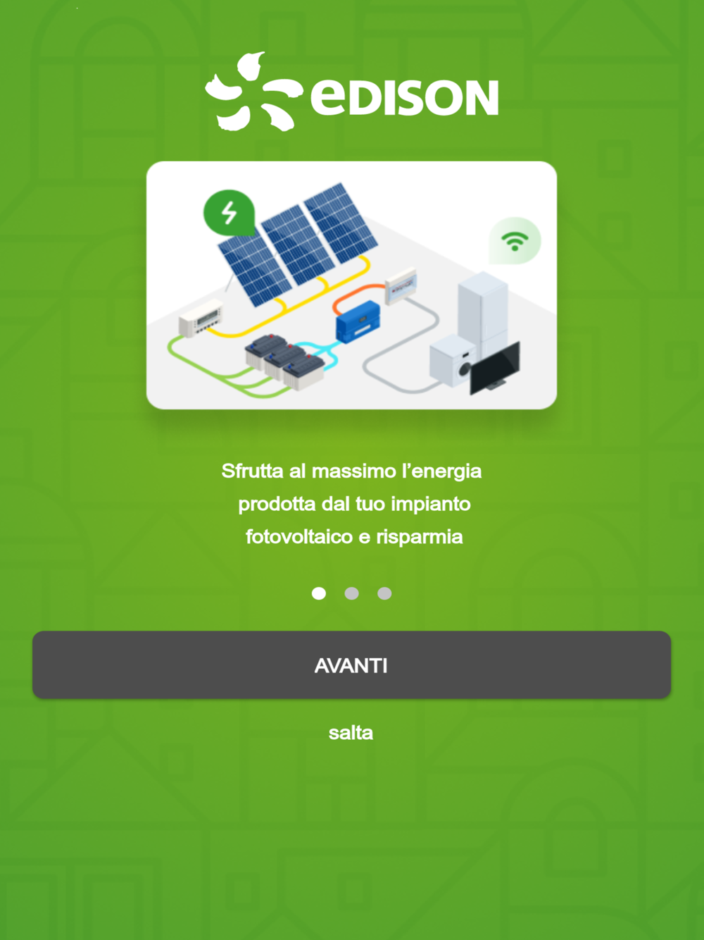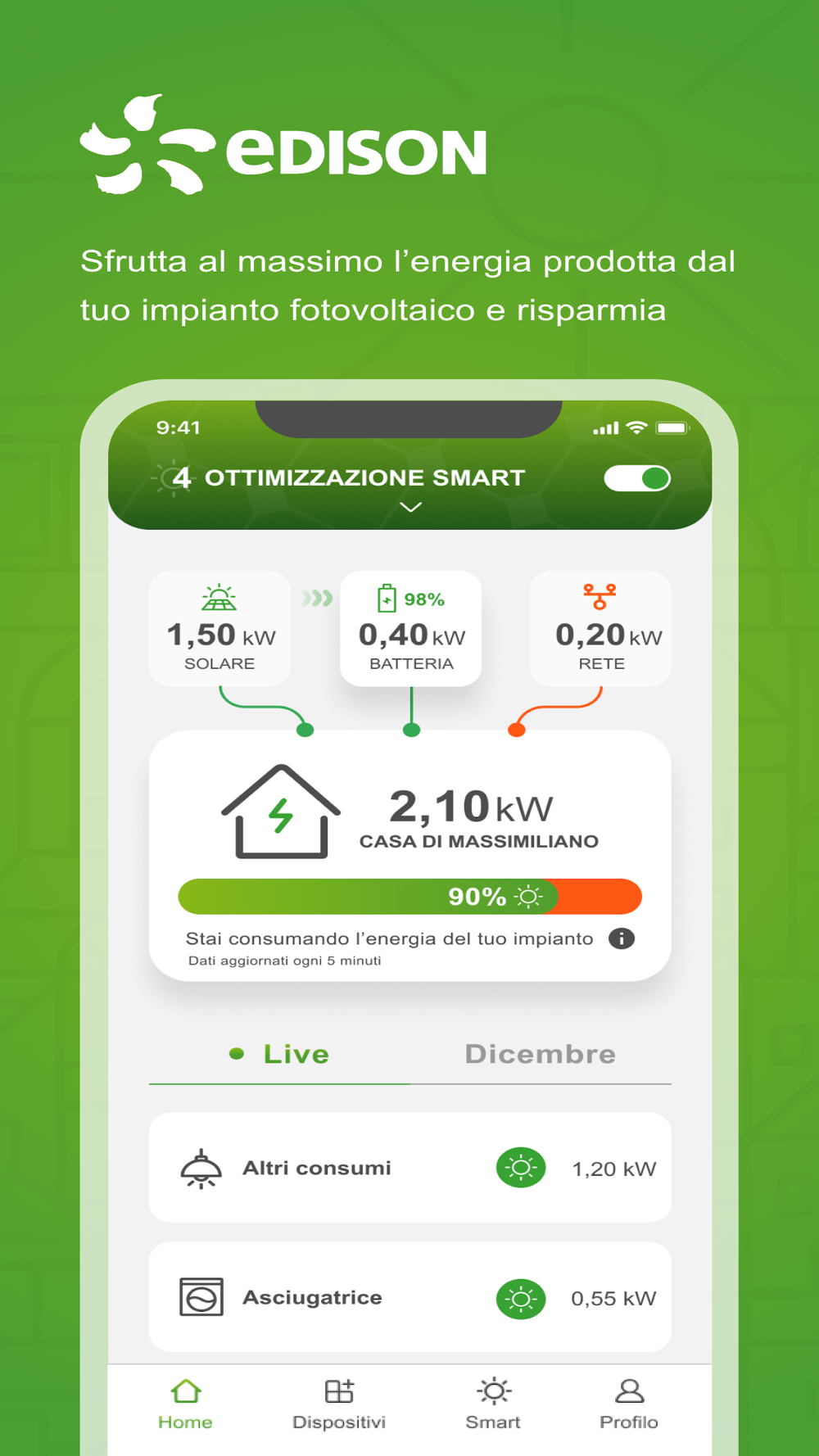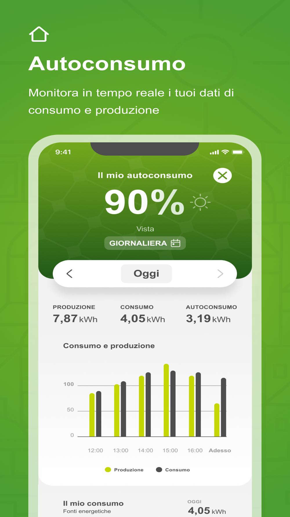 Con l’app Edison My Sun puoi monitorare il tuo impianto fotovoltaico in tempo reale. Attraverso dei semplici grafici puoi monitorare l’energia prodotta dal tuo impianto, l’energia prelevata dalla rete o immessa in rete e il consumo totale della tua abitazione.