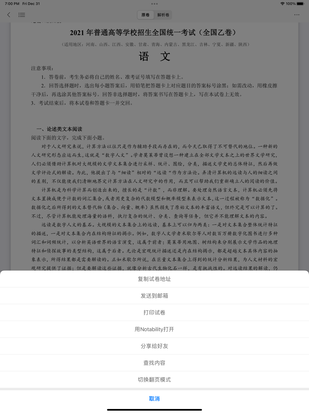 高考真题为高考学子整理和搜集了从2010年到2024年全科目共15年的高考真题试卷和对应的答案解析。我们用更极致的阅读渲染技术,让您体验到更完美的试卷阅读体验,其中包括了可自由切换的阅读方式,真题试卷和答案解析单独分离的清爽体验,独立的章节选择。您还可以随时随地下载试卷,打印试卷,无论是分享试卷文件还是试卷地址,您都可以轻松的和朋友一起分享学习。我们准备了以下省份的全科目高考真题试卷:北京,天津,河北,山西,内蒙古,辽宁,吉林,黑龙江,上海,江苏,浙江,安徽,福建,江西,山东,河南,湖北,湖南,广东,广西,海南,重庆,四川,贵州,云南,西藏,陕西,甘肃,青海,宁夏,新疆,涵盖全国所有的全科目历年高考真题试卷。