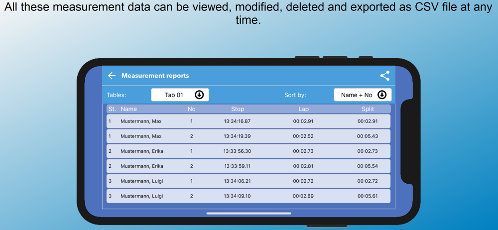 All these measurement data can be displayed, modified, deleted and exported as CSV file at any time.