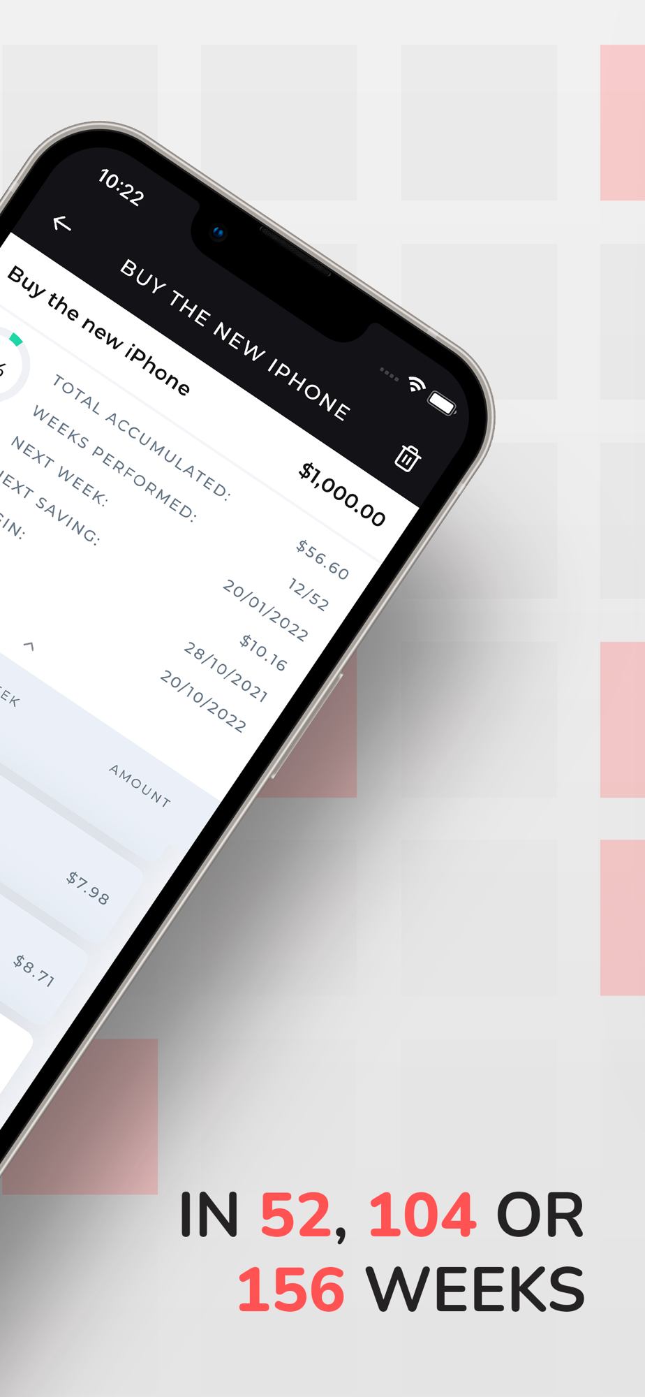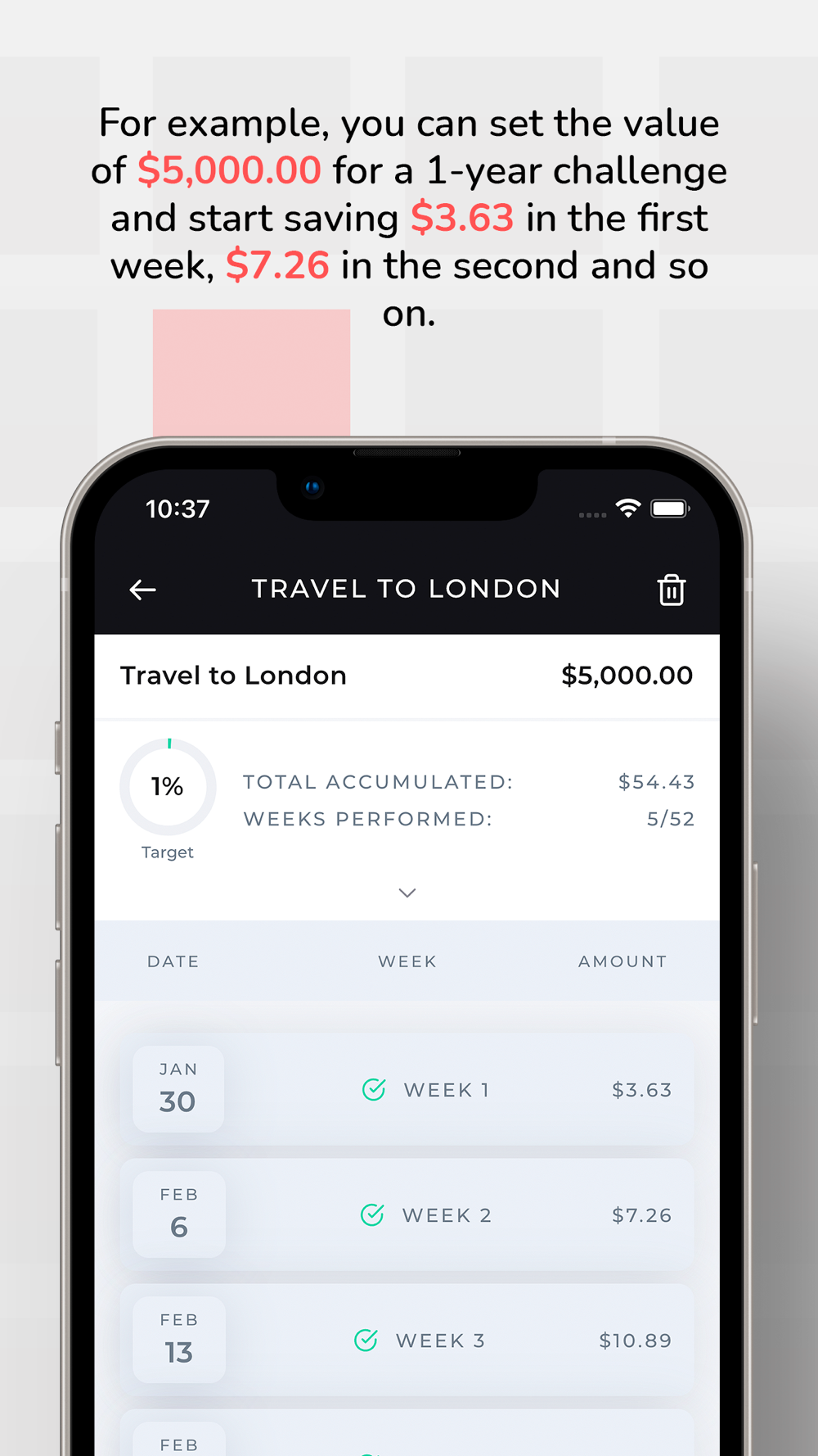 For example, you can set a value of $5,000.00 for a 1-year goal and start saving $3.63 in the first week, $7.26 in the second, and so on.