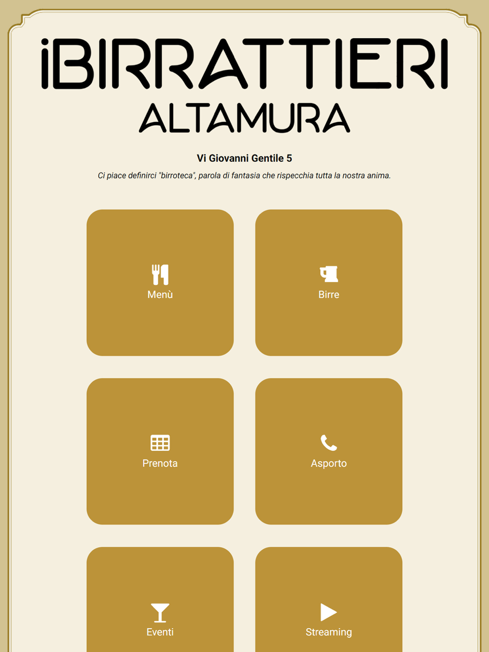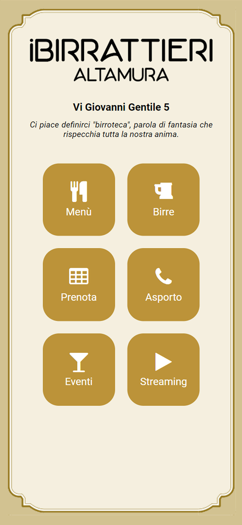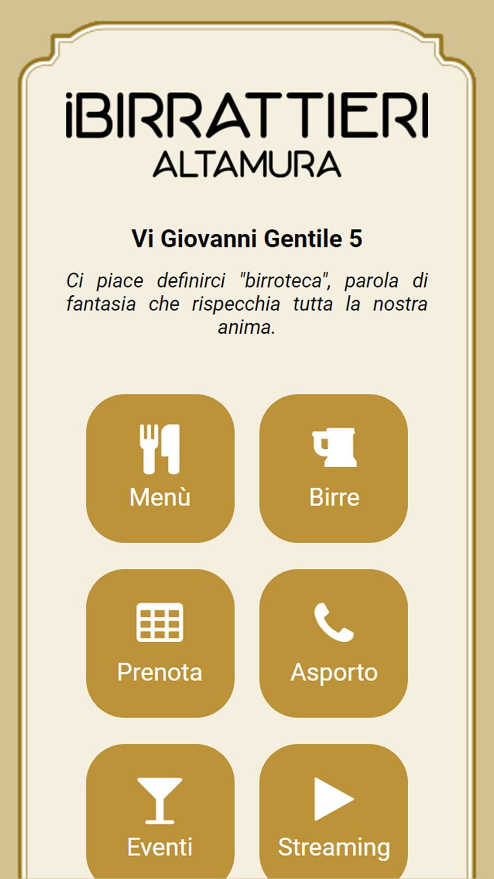 La app ufficiale de iBirrattieri Altamura ti permetterà di consultare il menù, la proposta di birre, di prenotare un tavolo, l'asporto e di seguire i nostri eventi streaming.