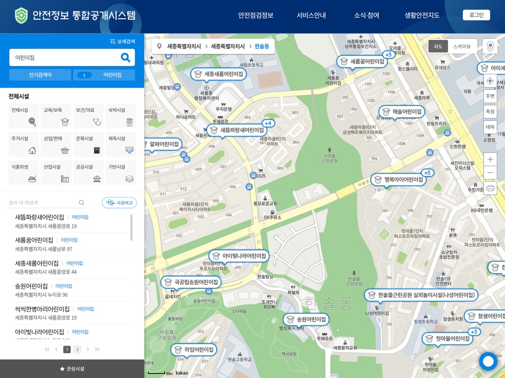 본 시스템에서 제공되는 정보는 학교시설, 어린이집, 놀이시설, 체육시설, 식품판매시설 등의 다양한 건축물 기준의 정보와 전기, 가스, 여객선, 교량, 댐 등의 기반시설이 있습니다.