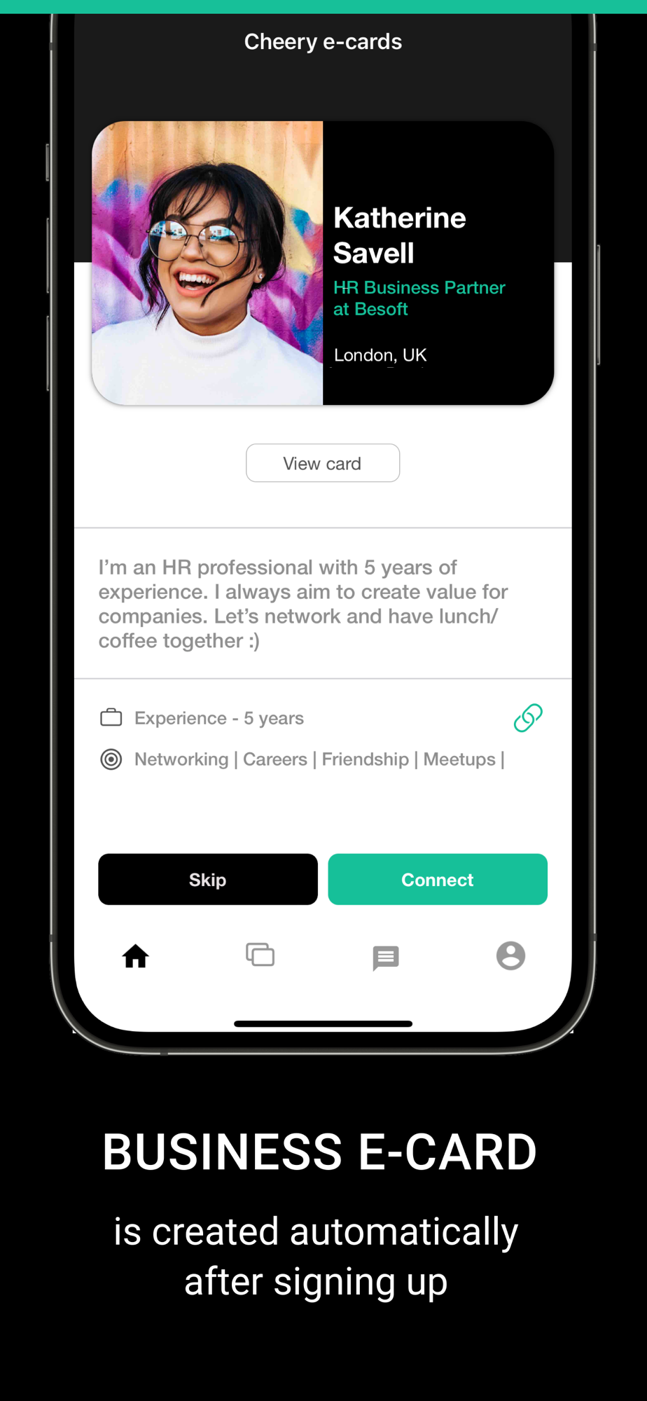 Unlike other networking mobile apps, with Cheery you instantly get a free digital business card, which you can edit and share with anyone via social networks and messengers. A stylish business card is your personal brand seller and an amazing digital marketing tool to grow your business network and boost you career. Your auto-generated business card is already looking sharp and stunning in the app.