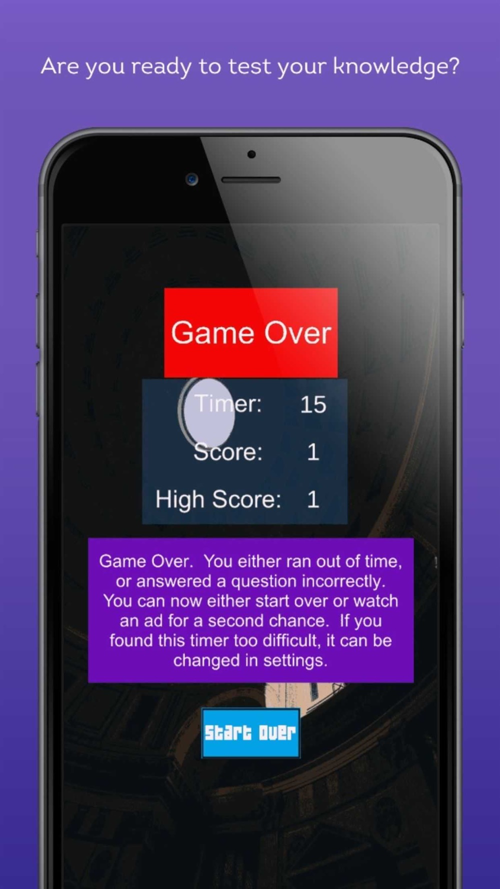 A limited amount of time is given to answer each question, to add challenge and excitement to the game. This timer can be adjusted in the settings menu.