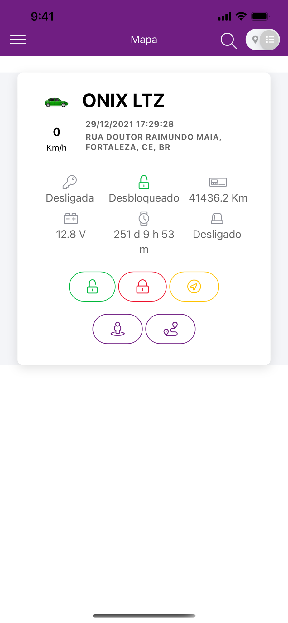 Com o aplicativo instalado no seu smartphone você poderá visualizar em tempo real a localização do seu veículo, além de poder executar ações como bloqueio e desbloqueio remoto do veículo.