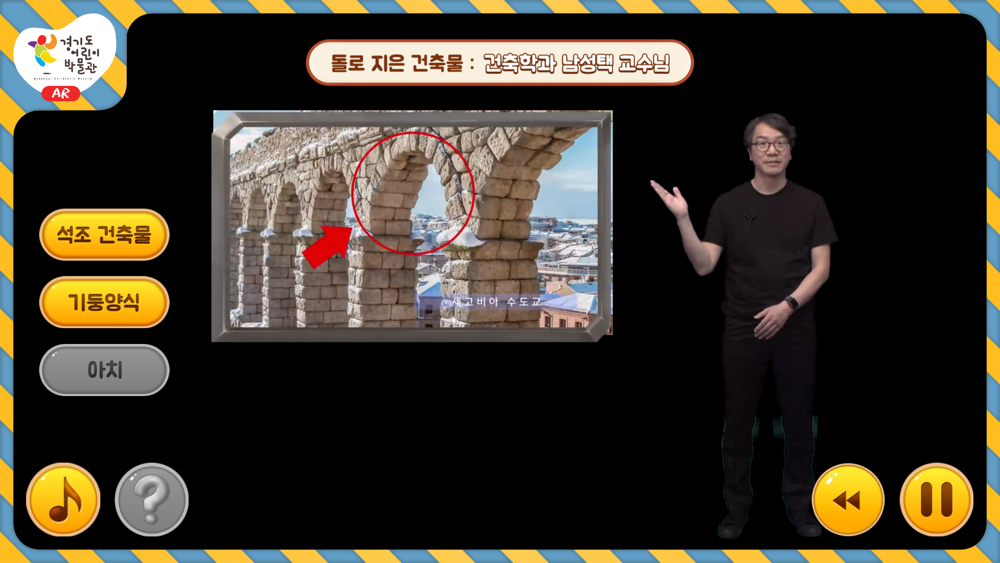 1. 나무, 돌, 철로 지은 건축물에 대해 건축가가 소개해 주는 AR 영상을 감상할 수 있어요.