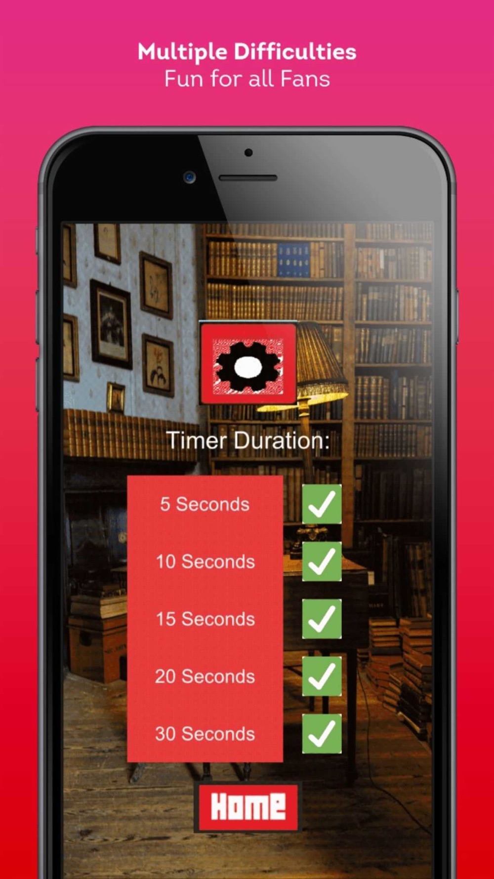 A limited amount of time is given to answer each question, to add challenge and excitement to the game. This timer can be adjusted in the settings menu.
