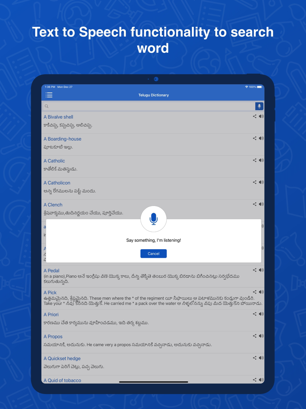 2- In Telugu Dictionary: Translator app, Users can search the word by their voice and read word meaning in both Telugu and English.