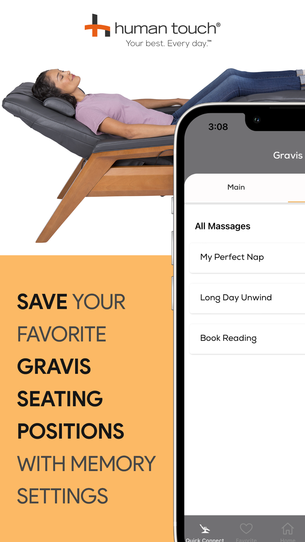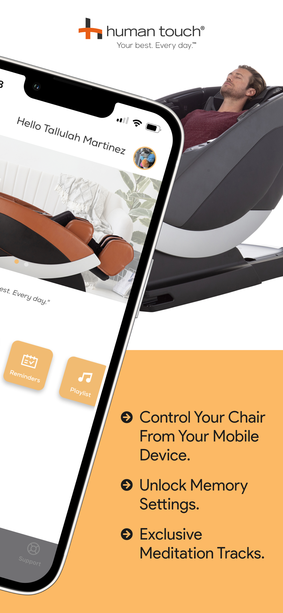 "The Human Touch® App is designed to help you get the most from your Human Touch experience by providing a tranquil escape from the stresses of everyday life. The seamless integration with compatible Human Touch chairs, immersive meditation audio, and a range of other features, will make this your go-to app for ultimate relaxation, rejuvenation, and recovery.