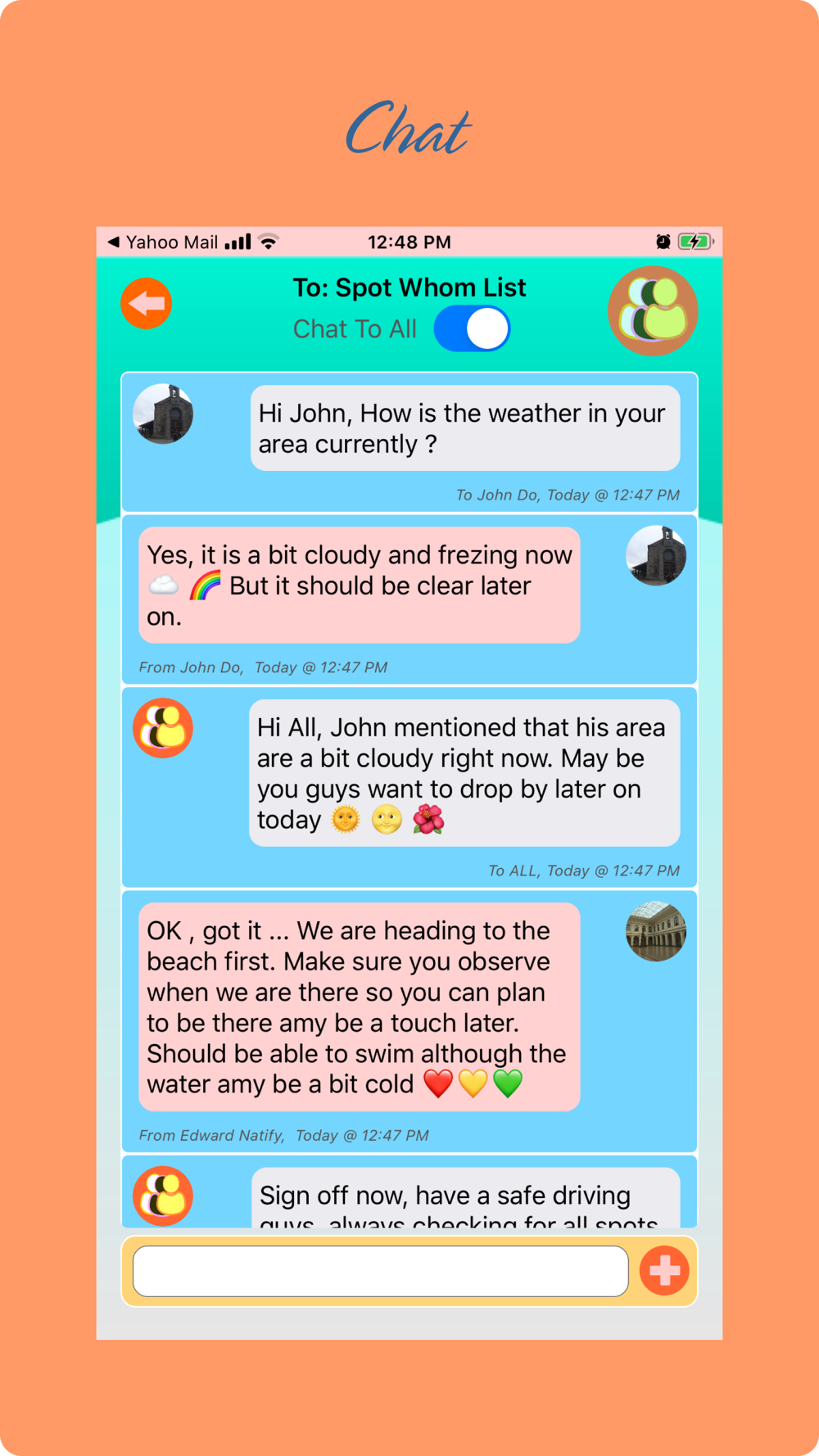 Spot any iPhone location anywhere on earth and 1-1 and/or group chatting with secured messages in real time.