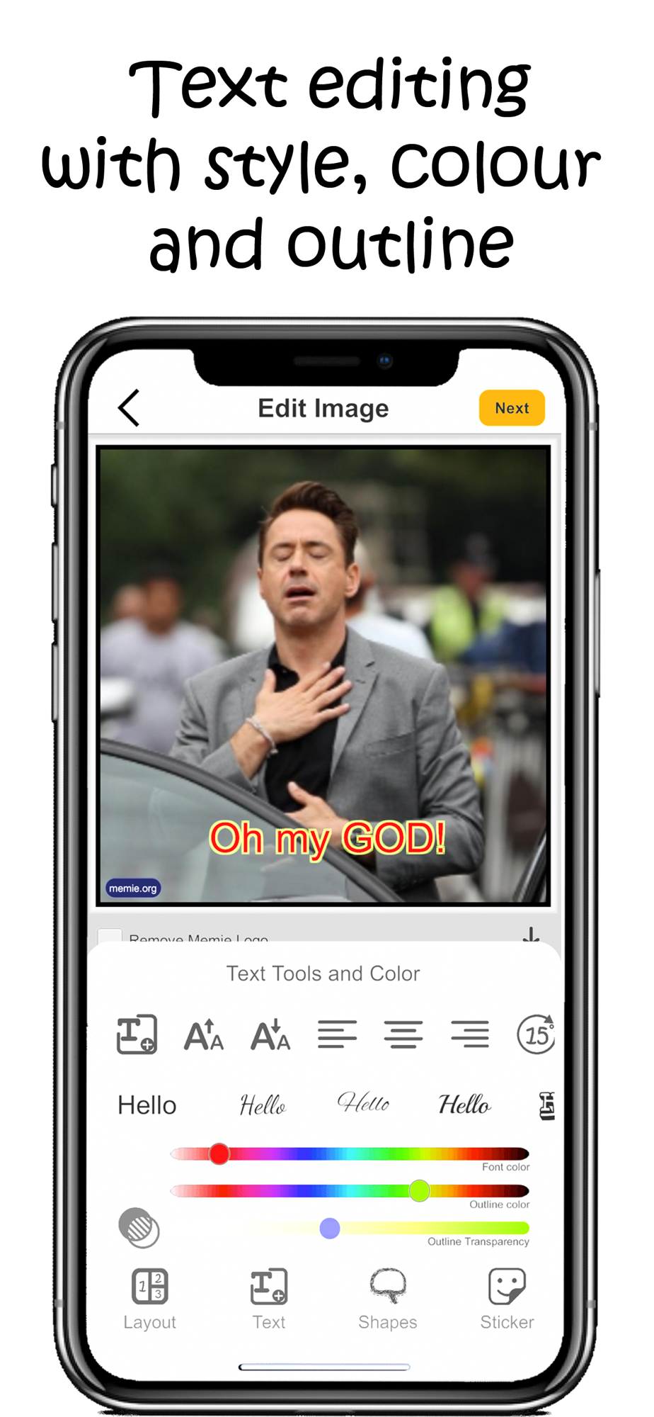 2) Design your unique meme image by adding caption text, changing the text font style, colour, Outline colour. You can arrange the caption text everywhere in images.