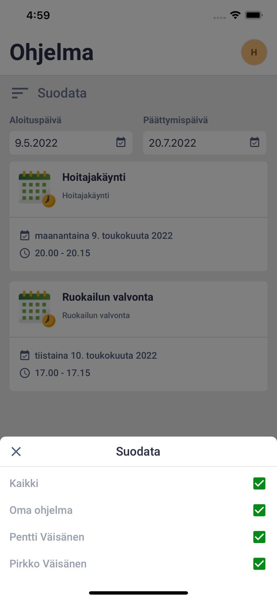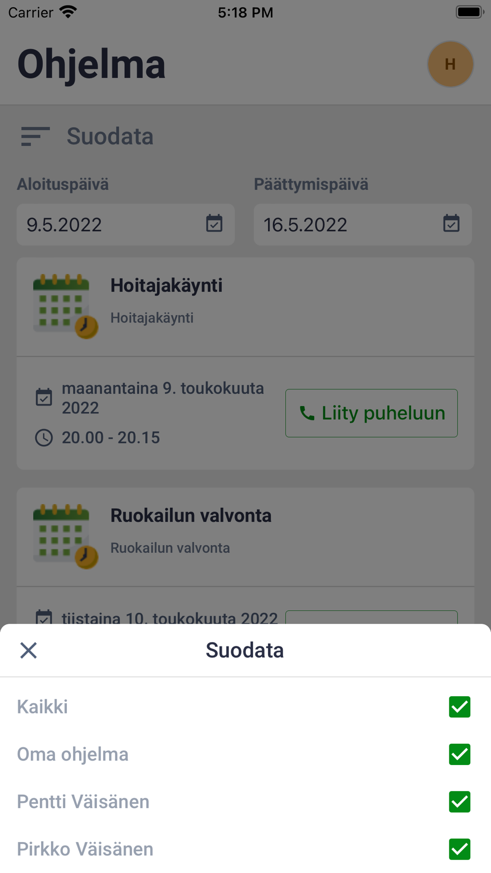 soitettavat videopuhelut virtuaalihoivan asiakkaan ja omaisten välillä. Palvelu on