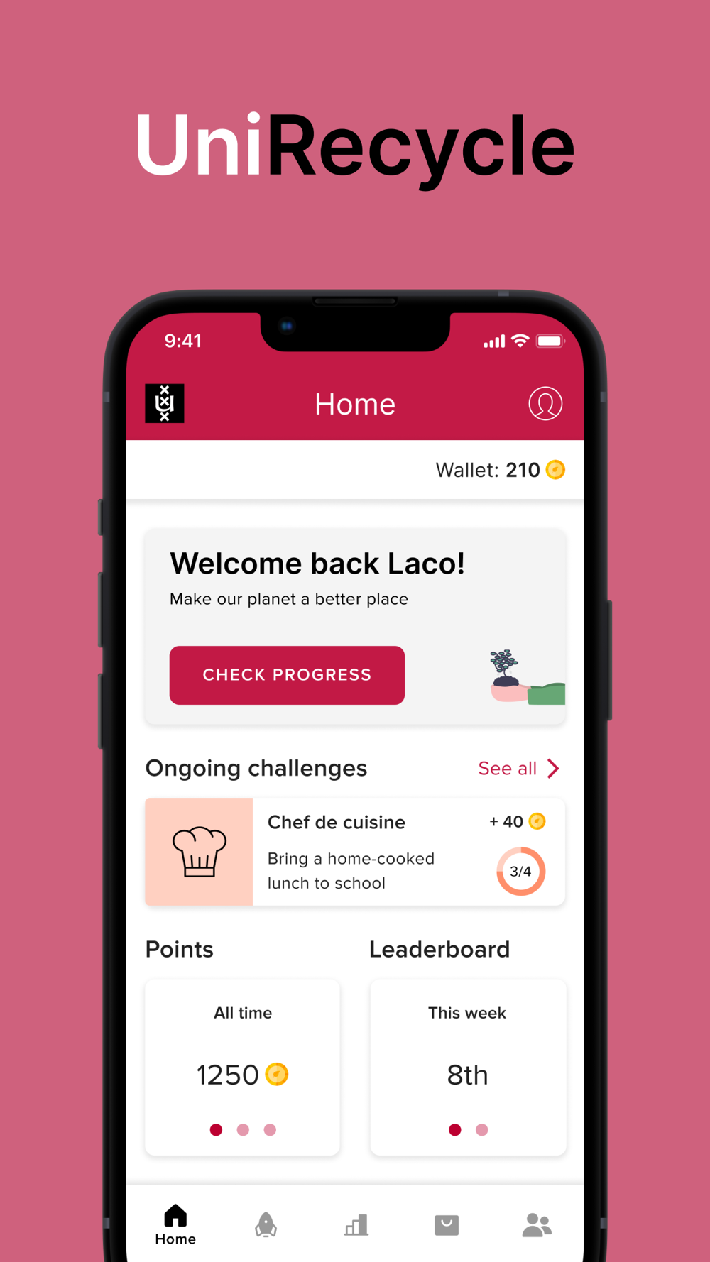The app is designed to motivate UvA students to make sustainable choices about their waste production and overall environmental impact. It works by providing the user with challenges centered around sustainability - for example, packing lunches in reusable containers, rather than purchasing a packaged lunch. Once challenges are completed, users earn sustainability points that can be traded for rewards (discounts from our sustainable partners). Combined points also contribute to users’ place on the leaderboard, allowing users to compete with other students. The gamification-based system utilizes evidence-based intervention strategies for behavioral change, such as nudges, goal setting, and competition.