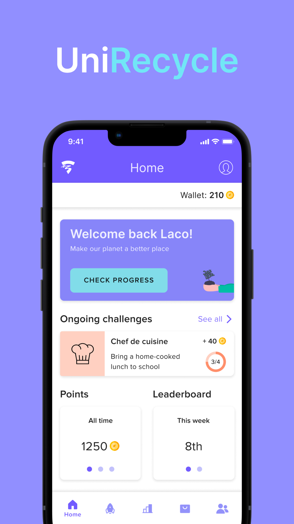 The app is designed to motivate HvA students to make sustainable choices about their waste production and overall environmental impact. It works by providing the user with challenges centered around sustainability - for example, packing lunches in reusable containers, rather than purchasing a packaged lunch. Once challenges are completed, users earn sustainability points that can be traded for rewards (discounts from our sustainable partners). Combined points also contribute to users’ place on the leaderboard, allowing users to compete with other students. The gamification-based system utilizes evidence-based intervention strategies for behavioral change, such as nudges, goal setting, and competition.